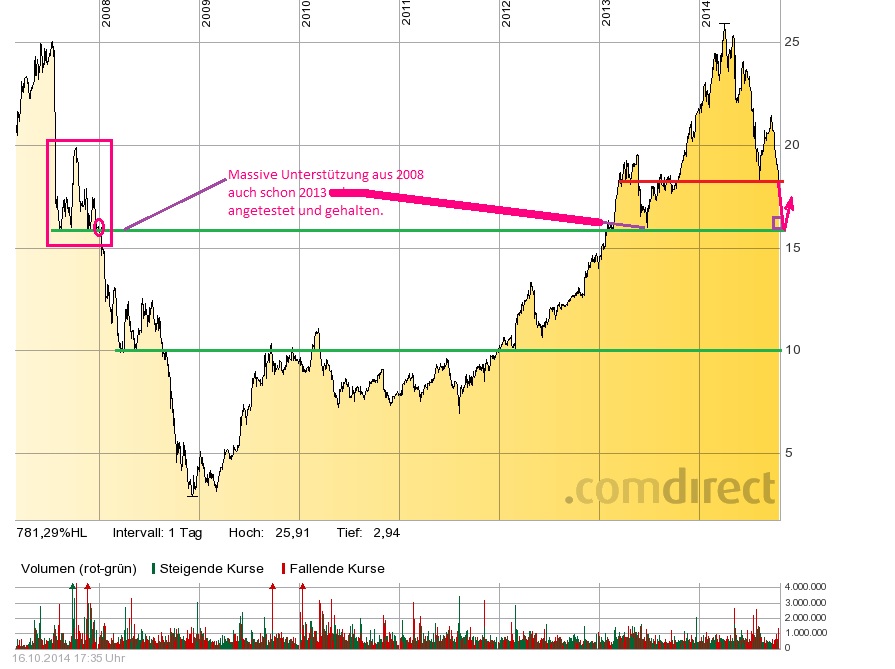 Tagesvolumen um Faktor 2-3 erhöht,200 Tage Linie unterschritten und auf Widerstand bei 22€