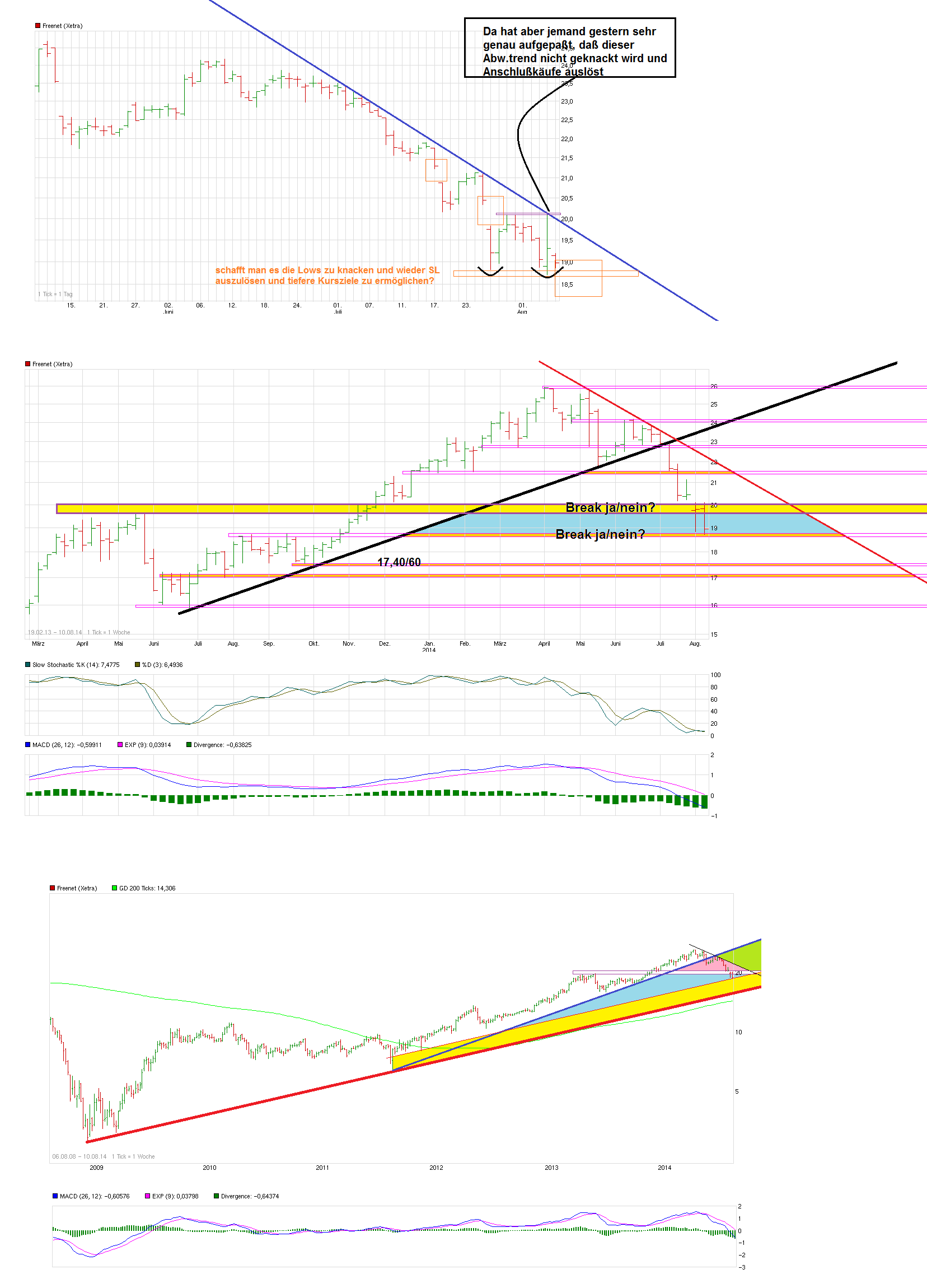 Schon etwas merkwürdige Kurse heute bei FNT. Da hätte man nach den ordentlichen Hj.1 Zahlen gestern eigentlich heute stabile Kurse über 19 erwartet. Gestern war die überwältigende Reaktion in den Medien/Kommentaren positiv zu den Hj.1 Zahlen und der Konsens dort war, daß die Befürchtungen vieler Leute im Vorfeld der FNT Zahlen überzogen war, da FNT weiter voll im Plan seiner Prognosen liegt. Da fragt man sich schon warum FNT an einem Tag wo sich die Börse etwas stabilisiert schon wieder eher am TecDax Ende liegt. Also so wie gestern sehr exkakt aufgepaßt wurde, das FNT bestimme Marken nicht überschreitet, habe ich den leichten Verdacht, daß hier weiterhin im Hintergrund Shorties/Leerverkäufe hoffen nochmal eine Etage tiefer sich erst wieder eindecken zu müssen und bis dahin ihre Kraft aufwenden keine "unschönen" Kaufsignale aufkommenzulassen. Wie lange das gelingt bleibt abzuwarten. Contour hat ja vor den Zahlen seine Nettoleerposi nochmal erhöht auf 1% und bislang nicht wieder reduziert. Parallel haben die auch bei DRI ihre Shortposi weiter aufgebaut. Vielleicht bauen die ja noch etwas weiter auf. Die Gefahr weiter unter die jüngsten Tiefs bei FNT zu laufen ist somit durchaus vorhanden. Nicht weil FNT fundamental teuer wäre (im Gegenteil), sondern weil der Gesamtmarkt noch weiter Luft ablassen könnte. Und dies vielleicht sogar einen guten Schluck weiter als manche Leute auf der Rechnung haben. Aktuell sollte man schauen, ob der DAX die 9166 nochmal klar auf SK überwindet. Heute ist man dort nach der EZB Entscheidung genau wieder abgeprallt nach unten. Wenn man klar darüber käme, dann könnte es vielleicht nochmal Richtung 9300/400 gehen. Aber eher vermute ich man wird sich um die bekannte Region von ca. 8900 kümmern. Sollte der DAX hier durchsacken, dann wäre die nächste horizontale Unterstützung direkt 400 Punkte tiefer bei ca. 8500. Da würden die Werte im TecDax, incl. FNT, natürlich mitleiden, wenn es denn so käme. Noch ist alles im Konjunktiv. Von daher kaufe ich im Augenblick bei FNT nicht zu (und auch so gut wie bei keinem anderen Wert) und sitze auf einer ungewöhnlich hohen Cashquote von knapp über 50% und warte erstmal ab, ob der Markt eben nur die alten Tiefs bei 8900 nochmal sehen will oder es lieber auf die harte Art angehen will, wo dann nochmal ganz andere "Schnäppchenpreise" kommen könnten als was jetzt aktuell bei vielen guten Werten schon zu sehen ist. Und wenn irgendwas Geld-/Geopolitisch noch weiter stark störendes hinzukäme, dann wären auch im Extremfall DAX Stände unter 8500 nicht undenkbar. ( => www.brn-ag.de/...t-Boersenampel-auf-ROT--DAX-mit-8000-moeglich ). Von daher halte ich aktuell mein Pulver trocken und hedge weiterhin mein Depot mit DAX Shorts bis mir die Lage wieder etwas eindeutiger erscheint oder charttechnische Longsignale überzeugen. Aber vielleicht bekommt ja Putin Lust Obama eins auszuwischen und mutiert über Nacht zum Friedensengel, um dann wie Obama schon auch den Friedensnobelpreis zu bekommen. Dann wäre etwas Relief Ralley möglich ;)