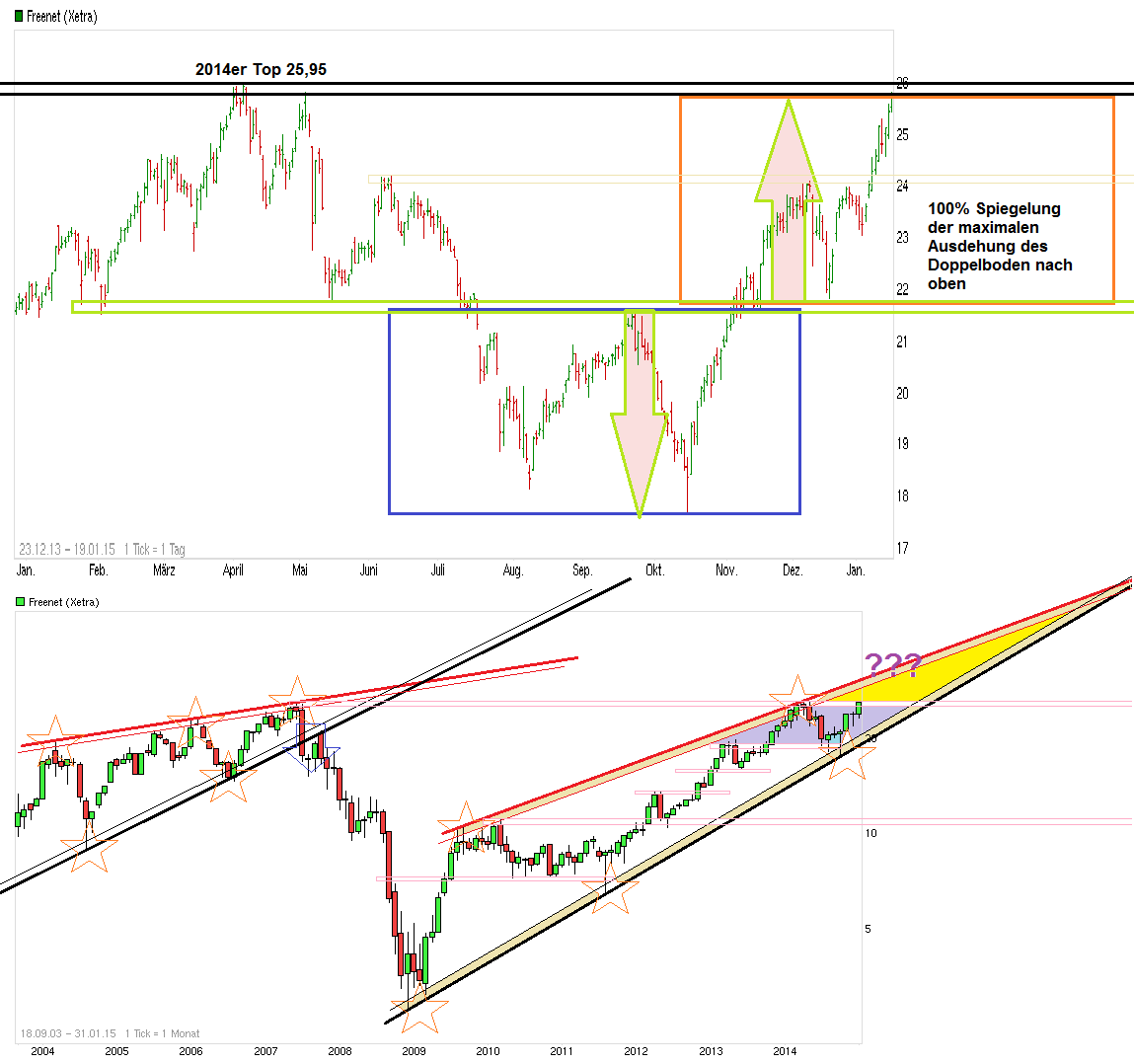 Also es gibt Growth und Value Werte. ( www.morningstar.de/de/news/36286/...ied-von-tag-und-nacht.aspx , boerse.ard.de/boersenwissen/...d-growth-die-klassiker-100.html ). Für mich ist FNT klar Value. Daher eigentlich auch eher albern im TecDax zu sein. Der war ja eigentlich für andere Werte gedacht. Aber die Sinnlosigkeit der Zusammenstellungen des TecDax wäre nochmal ein Thema für sich ( www.welt.de/finanzen/article109126575/...in-Auslaufmodell.html ). Die Valuewerte haben in der Regel hohe Divis, dafür aber wenig Wachstum. KGV von 10-12 (mit etwas gutem Willen auch noch 13) ist da für gewöhnlich o.k. . Growth Werte haben ein hohes Wachstum, dafür aber eine relativ niedrige DiviRendite. Allerdings billigt man denen deutlich höheres KGVs zu wg. der Pespektive. Wenn FNT kein Wachstumstempo 2016 ff bringen kann was über dem für 2015 prognostiezierten liegt, dann wäre ein 15 KGV ( entspricht ca. 30€ ) für mich einfach teuer. Da gäbe es Aktien die günstiger sind bzw. klar mehr Wachstum haben. Von daher kann meinetwegen der Markt irgendwelche Übertreibungen hinlegen, aber ich werde mir das dann nicht versuchen fundamental noch schönzureden, sondern wie in ähnlichen Marktphasen der letzten Jahrezehnte aufpassen, daß man nicht verpaßt den Peak der Euphorie zur Gewinnmitnahme zu benutzen. Divi ist eine Vermögensentnahme. Hat man eine sehr hohe Ausschüttungsquote ( FNT z.B. über 70%), dann nimmt das logischerweise auf der anderen Seite dem Kurswachstum auf Dauer Tempo weg. O.K., wer eine Aktie sucht die lediglich mehr an Rendite bringen soll als sein Sparbuch, der mag alleine mit der DiviRendite von FNT schon zufrieden sein. Allerdings ist der Aktienmarkt groß und die Alternativen dort auch. Wegen einstelliger Rendite p.a. alleine gehe ich in keine Aktien. FNT kommt nun langsam in einen Kursbereich wo ich selber nicht noch mit voller Kraft einsteigen würde. Aussteigen tue ich deswegen aber auch noch nicht. Aber ich orientiere mich verstärkt an der Charttechnik, z.B. als Absicherungsnetz ( Hedge falls bestimmte Marken nicht halten). Da schaue ich lieber, ob es nochmal größere Rücksetzer gibt ( habe z.B. im Oktober nachgetankt) oder daß ich wie in den letzten Jahren immer in Phasen hoher Kurse wieder abbaue ( z.B. kurz vor der HV, wenn die ganzen Börsenblättchen wieder jährlich vorher reintrommeln mit Phrasen wie "Dividendenperle" und ähnlichen Karteikartensprüchen der Vorjahre ohne auch nur minimal fundamentale Dinge zu beleuchten.) Im Kern ist eben vieles durch die Notenbanken gesamtmarktgetrieben. Auch FNT, wenn man ehrlich ist. Daher trade ich gegenwärtig auch fast ausschließlich Bewegungen auf der großen Wiese und halte mich bei Aktien mit Käufen etwas zurück. Nicht falsch verstehen, FNT ist ein solider Wert. Ein Golf ist z.B. auch sein solider Wagen. Sollte man deswegen aber irgendwann anfangen den Preis für einen 3er BMW zahlen? Wenn die Leute zuviel billiges Geld haben, dann machen sie es vielleicht. Wenn die Notenbanken weiter endlos die Märkte zufluten mit QE und es niemehr Inflation gibt, dann macht der Markt vielleicht wieder Kapriolen wie Ende der 90er. Ich schließe nichts aus. Aber fundamental ist dann nicht mehr alles begründbar, sondern dann kommt man langsam wieder in Blasenbereiche. Und wehe da kommt plötzlich einer mit einer Nadel....