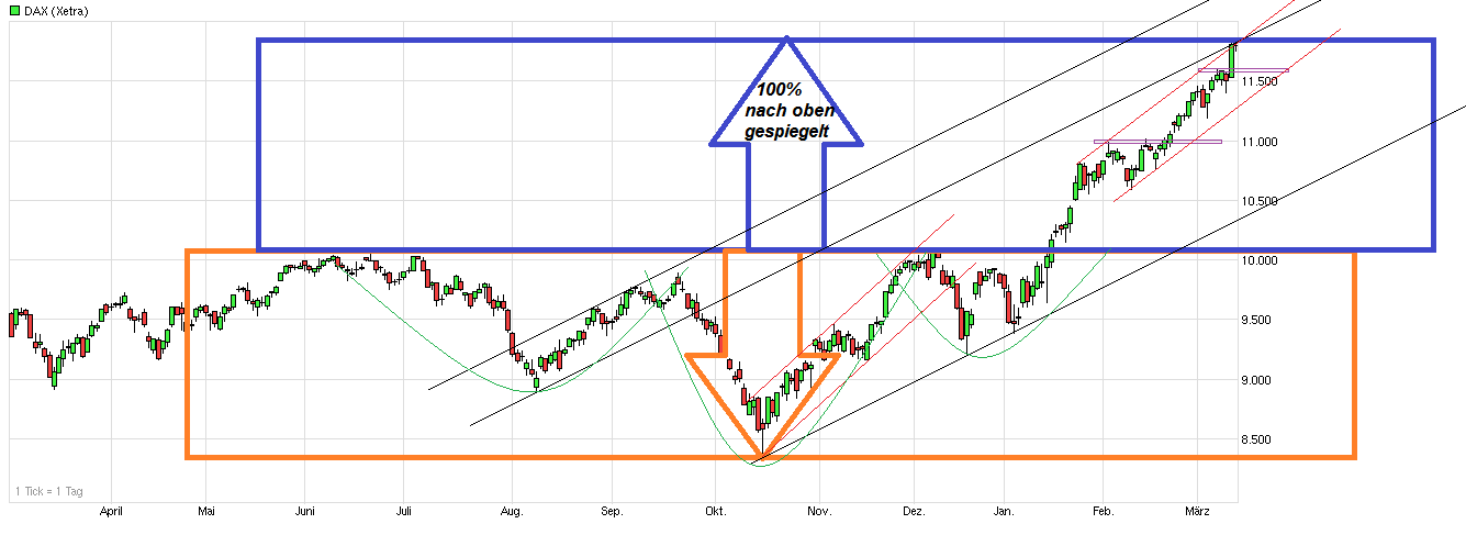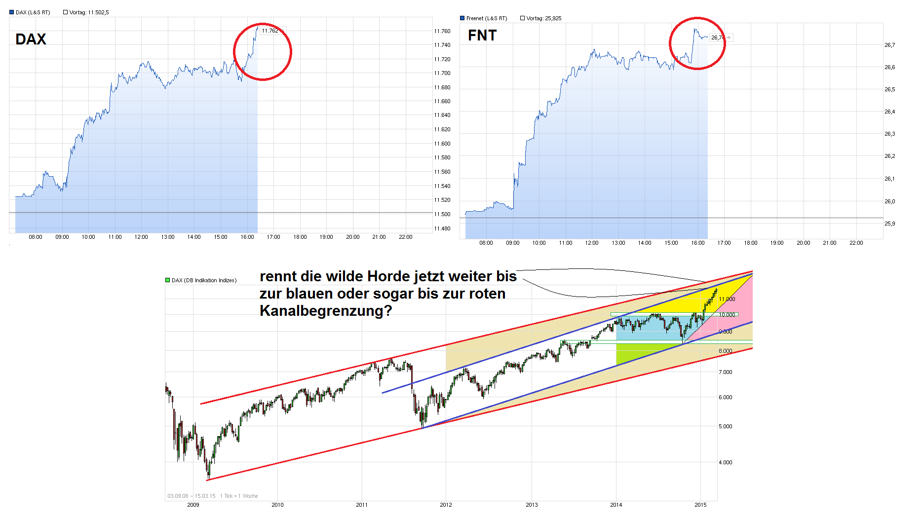 vom zu heftigen Tänzchen gestern nun heute etwas auskurieren? FNT kommt nicht weiter an die 27 ran und der DAX steht auch vor einer Hürde. Man hat aktuell die 100% Ausdehung der alten 2014er Seitwärtsrange erreicht. Bin daher bei 12830 mal short gegangen. Und die Frage ist auch, was die großen Jungs in ca. 1 Woche für Kursstände sehen wollen beim großen Verfall. Eher näher an der 11800 oder der 12000 (und damit auch die ca. 200 Punkte noch holen die fehlen, um auch beim Kurs-DAX ein neues ATH zu sehen bzw. um an das alte ATH dort ranzulaufen)? Und will man am Verfallstag auch eine FNT nicht über 27 haben? Die US Märkte schauen ohnehin wohl erstmal gespannt auf das Wording der FED in der kommenden Woche. www.finanzen.net/nachricht/zinsen/...ite-raeumen-4232409@print Fällt das Wort "geduldig" weg, dann könnte das Thema Zinsen weiter hochkochen (auch wenn ich nicht glaube, daß die FED angesichts der noch immer sehr niedrigen US-Inflation und der zunehmenden Belastung der US Wirtschaft durch den immer stärkeren Dollar weit vor Jahresende anfangen wird Zinsen zu erhöhen)