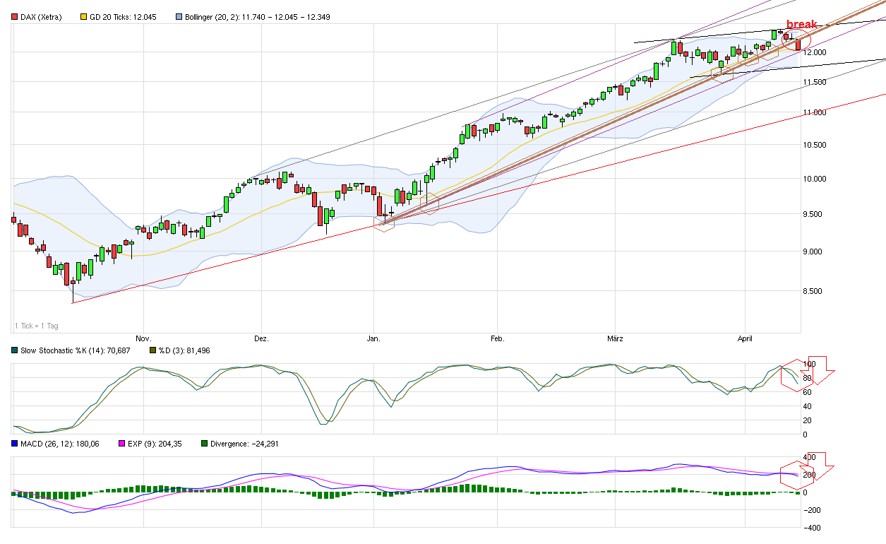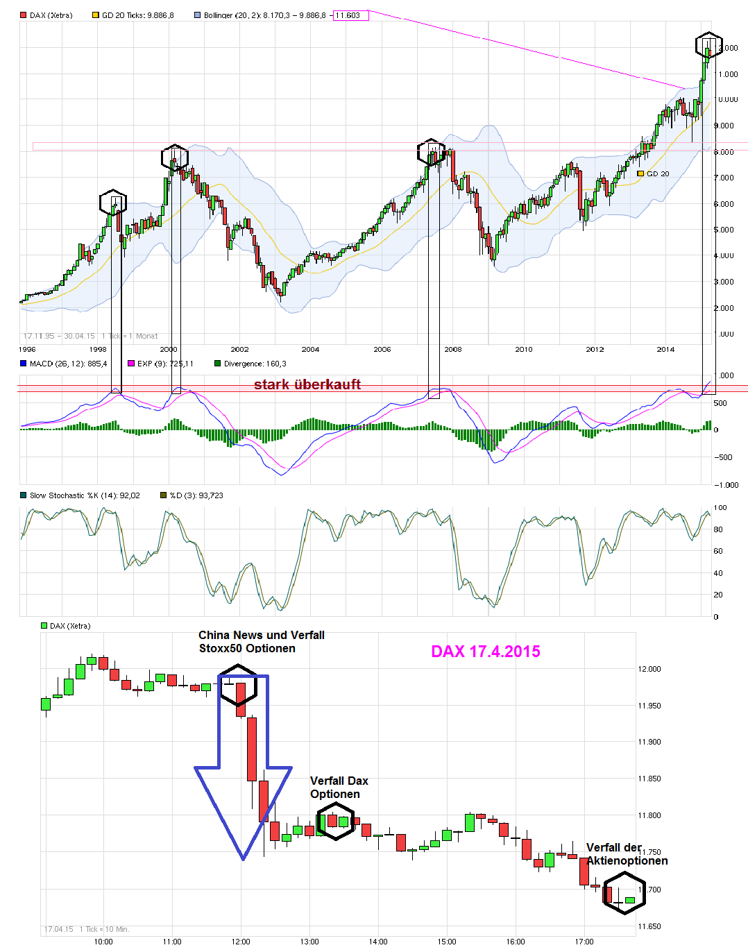 Fragt sich nur, ob für die Bullen oder die Bären ;) Also der Wochenausklang war schon recht deftig. Da sieht erstmal jetzt tendenziell bearisch aus mit der großen negativen Wochenkerze von letzter Woche im Rücken. Zumindest solange nicht wieder bestimmte Marken nachhaltig zurückerobert werden. War aber natürlich auch ein Sch...ßtag für eine Korrektur. Und das die Bloomberg-Terminals auch noch einen plötzlichen globalen "Feiertag" einlegten in der Phase vor dem Verfall, hat sicher auch nicht geholfen. Schließlich kommen an einem Verfallstag die großen Jungs schnell im Schieflage, wenn das Pendel sich zu sehr gegen sie bewegt. Dann müssen die wie blöde Gegenpositionen kaufen. Hat man ja gesehen beim Verfall der Stoxx50 Optionen gegen 12:00 am Freitag. Genau in dem Zeitraum kam ?"zufällig"? die Info zu China und den Shortabsicherungen. 4:45 AM EDT April 17, 2015 U.S. stock-index futures retreated as Chinese futures tumbled after regulators updated rules on margin trading and short selling in a market where equities have led global advances for the past year. E-mini contracts on the S&P 500 expiring in June fell 0.7 percent to 2,087 at 7:38 a.m. in New York, reversing an earlier gain of as much as 0.1 percent. Dow Jones Industrial Average futures fell 132 points, or 0.7 percent, to 17,909. The news out of China “is hammering stocks as we approach the U.S. open,” Craig Erlam, London-based analyst at Oanda Corp, said in an e-mailed note. “What we’re seeing right now is a combination of panic and technical levels being wiped out and exacerbating the move lower.” Chinese stock-index futures tumbled in after-hours trading after regulators clamped down on the use of shadow financing to buy equities and expanded the supply of shares available for short sellers. The China Securities Regulatory Commission banned the margin trading businesses of brokerages from taking part in umbrella trusts, while the Securities Association of China said fund managers can lend shares for short selling. Futures in Shanghai and Hong Kong plunged following the release, with contracts on the Hang Seng Index down more than 2 percent. Investors have ramped up wagers on stocks by borrowing through umbrella trusts, which allow for more leverage than brokerage financing. Permitting mutual funds to lend their holdings to short sellers would make it easier for bearish traders to bet on a retreat after the benchmark Shanghai Composite Index more than doubled over the past 12 months. ©2015 Bloomberg