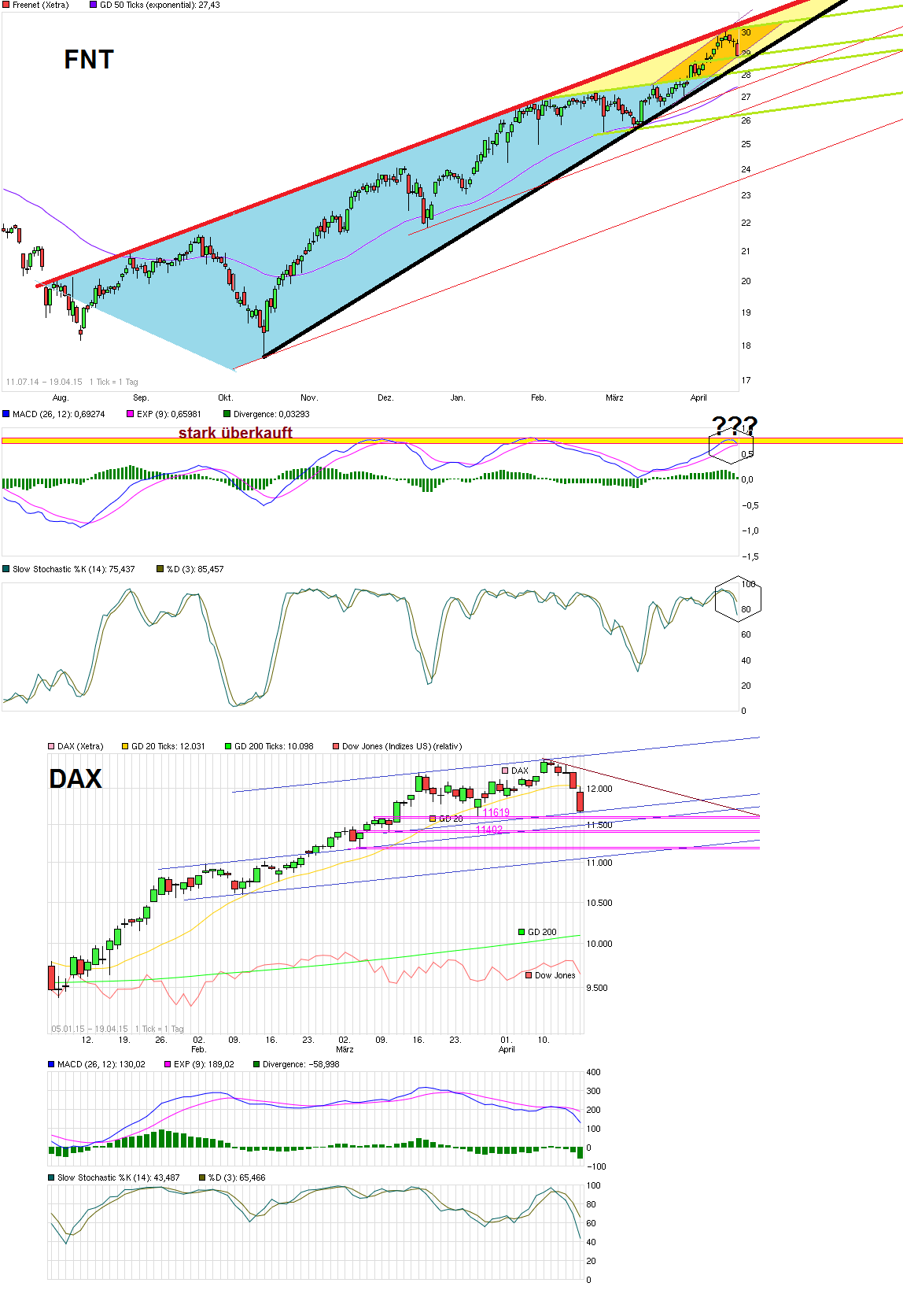 Das hat nicht nur direkt auf die US-Futures gewirkt, sondern natürlich auch auf unsere schon geöffneten Märkte hier. Hatte also am Freitag relativ wenig mit Grexit-Angst zu tun, anders als was manche Kleiderständer bei NTV mal wieder der Sache andichten wollten. Die News aus China hatte im Verfallszeitraum also einen Schreck ausgelöst, der sich dann im DAX um nette 250 Punkte ausdehnte bis zum Verfalls der DAX Optionen gegen 13:00 und bis zum Verfall der Aktienoptionen gegen Handelsende weiterging, da ja auch noch der Handel in den USA lief, wo ebenfalls der Blues die vorherrschende Musik war. Jetzt ist man heute erstmal vom "Druck" des Verfallstags befreit und kann etwas Rebound hinlegen. Und aus China kaum auch etwas frische Scherzlinderung ( => http://www.ariva.de/news/...rdsenkung-beim-Mindestreservesatz-5340645 ).Ist halt nur die Frage, ob das lediglich ein Luft holen ist von dem nächsten Abtaucher Richtung 11400 oder ob man erstmal den Boden gesehen hat bei der Konso. Denke der Knackpunkt dürfte der Bereich um die 11619 sein. Wenn man da noch durchbräche, dann dürfte wohl die nächste SL-Welle einsetzen. Wenn man sich anschaut, daß im Monatskerzen-Chart des DAX das obere Bollinger Band erst bei ca. 11600 liegt und man immer noch extrem weit über der SMA200 liegt, trotz der Korrektur der letzten Woche und man dem Dow extremweit enteilt ist, dann wäre es eigentlich gesünder noch etwas weiter die Überkauftheit der letzten Monate abzubauen, um wieder innerhalb der Bollinger zu bleiben. Kann in einem ausgedehnten Seitwärtstanz geschehen, kann aber auch in einem weiteren Schritt nach unten geschehen, wenn die Zwischenerholung vorbei ist. Dann müßte man unter Umständen im Extremfall auch mal wieder auf das mittlere Bollinger Band im Monatskerzenchart achten. Von daher bin ich erstmal vorsichtig und warte auf klarere Signale. So steht die Börsenampel für mich erstmal weiter auf Gelb. Habe letzte Woche bei einigen meiner Depotwerte Teilgewinne mitgenommen und die Cashquote weiter aufgebaut. Warte jetzt ab, ob es nochmal interessantere Kurse zum nachkaufen gibt. Und wenn es doch nur fröhlich weiter läuft nach oben, dann wäre ja noch immer ein gewisser Bestand im Depot. Denke so fix dürfte DAX&Co nicht neue Hochs machen. Daher einfach mal entspannt schauen was sich anbieten wird für einen etwas länger angelegten Aktienkauf und was sich für schnelle kurze Trades anbieten wird. Wenn nichts kommt, dann schau ich eben mal nach dem freigewordenen Biergartenplatz von Johnny Utah ;)