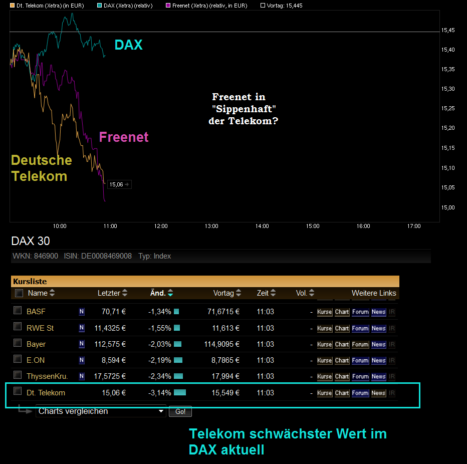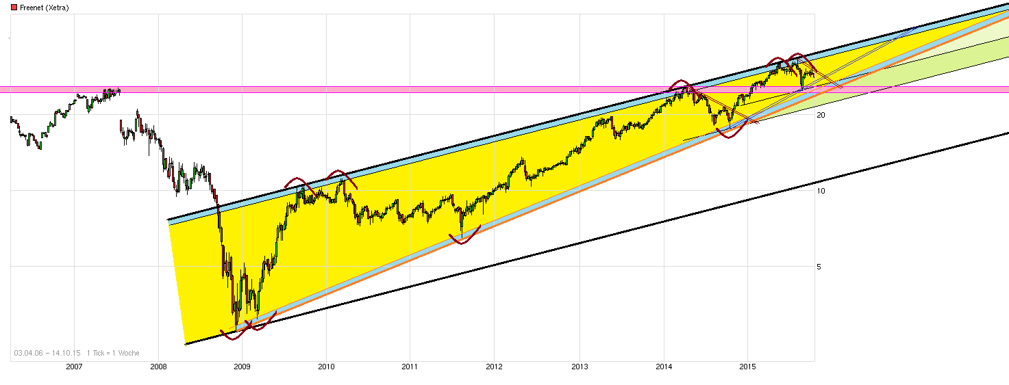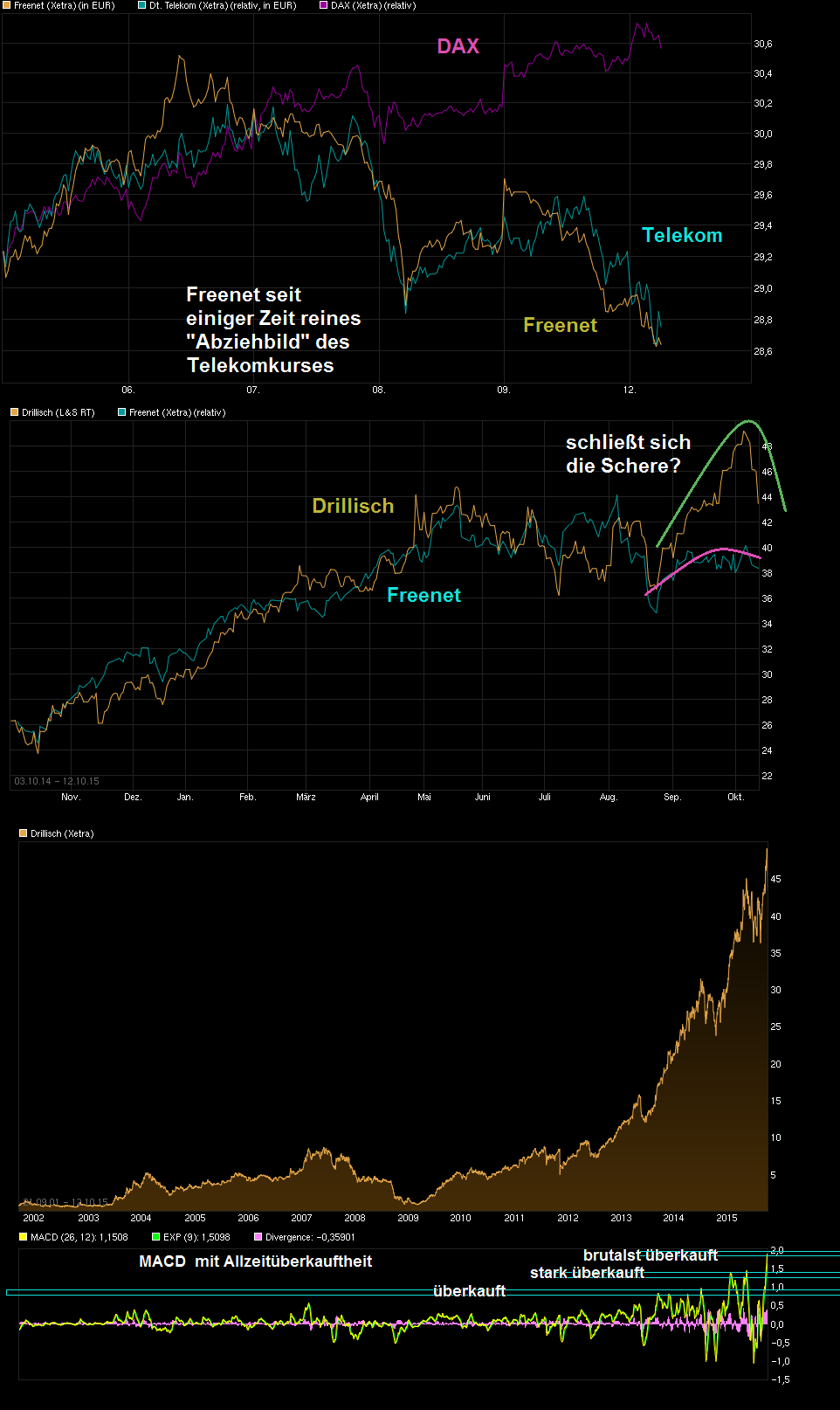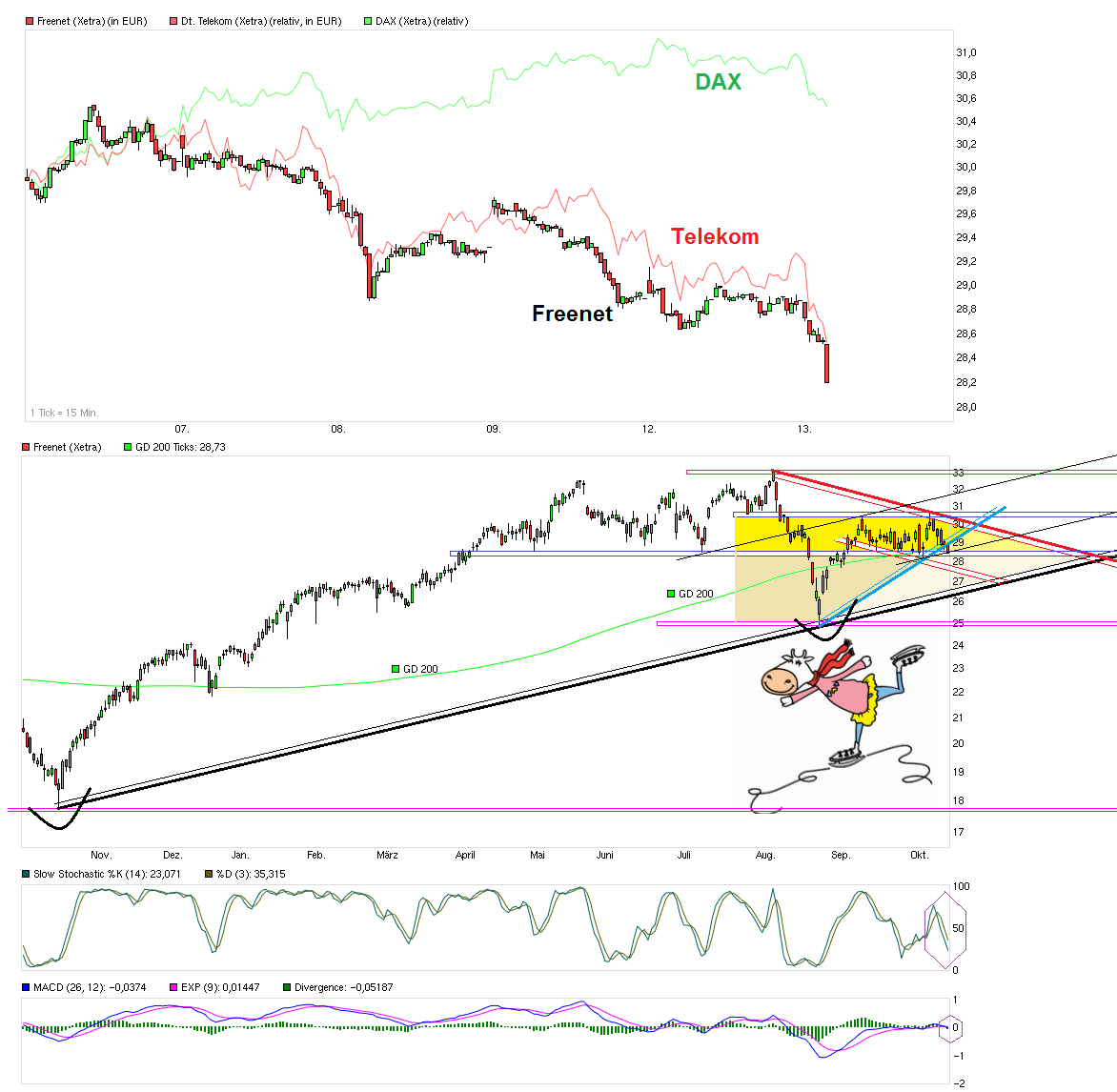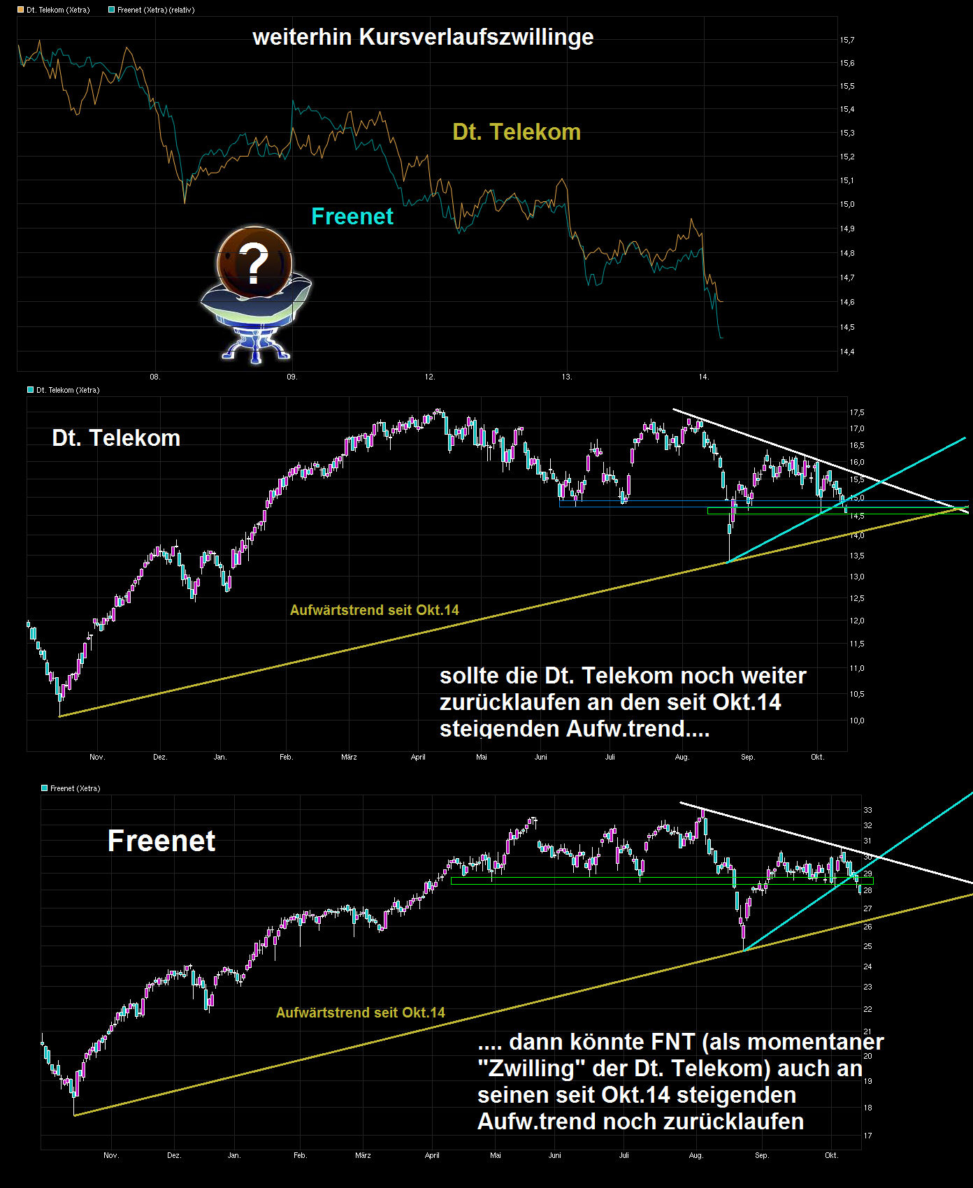 ...und versuchen die Kuh wieder vom Eis zu ziehen mit weiteren Käufen? Danke. Wäre nett, wenn man bis zu den Q.3 Zahlen jetzt auch nicht mehr anfängt irgendwelche Kapriolen auf der Unterseite zu machen nachdem man sich doch auf einen Schlafwagenmodus bis zum 5.11.2015 eingestellt hat ;) Aktuell eine nicht so angenehme Gemengelage. Indizes konsolidieren (interessanterweise aktuell der sonst so feste Tecdax sogar etwas schwächer als der DAX), die in den Vormonaten gegenüber anderen Branchen gut gelaufenen Telkowerte geben in der jüngsten Zeit mehr ab als der Gesamtmarkt und bei Freenet ist jetzt mit Flossbach zusätzlich noch ein größere Aktionär dabei seine Bestand abzubauen und niemand kann absehen wie weit unter 3% die Truppe noch gehen wird. Man hatte die letzte Zeit bei FNT gesehen, daß kleine Erholungen regelmäßig genutzt wurden, um dann immer wieder schubartig schnelle Absacker hinzulegen. Da ließ man dann wieder die Kleinanleger etwas kaufen bis wieder ein besseres Abgabeniveau erreicht wurde, um dann wieder abzugeben. Klassische Distribution, wenn ein größerer Anleger in kleinere Hände weiterreicht und dabei aber möglichst kursschonend abbauen will. Von daher hoffe ich mal, daß im Falle Flossbach wäre noch etwas weiter auf der Abgeberseite, die Jungs weiterhin nicht zu schnell zu viel abwerfen und zwischendurch auch wieder gewisse Erholungspausen zulassen. Break des kurzfristigen seit August steigenden Aufw.trend bei FNT nicht wirklich stimmungsbegünstigend. Was heute !bislang! nicht schön ist, daß ist der Rutsch unter 28,40/50 und der Rutsch unter die SMA200. Könnte aber natürlich durchaus sein, daß man hier noch zum SK mit etwas gezieltem Rebound an/über die Marken zurückläuft und man doch wieder in der gwohnten Seitwärtsrange landet. Hatte man jüngst ja schonmal so ähnlich gesehen, daß man da dem Kurs nochmal unter die Arme griff als man kurz nach unten rauslief. Im etwas größeren Bild (Jahressicht) sieht man nicht nur die die mehrwöchig zähe Seitwärtsrange von roundabout 28,40/50 -30,50/50, sondern eben auch den seit dem großen Low von Oktober2014 steigenden Aufw.trend und den Abw.trend der seit dem 15er Jahreshoch läuft. Da muß man auch mal schauen welche der beiden Trendlinien man lieber in den kommenden Wochen anlaufen will. Sollte man nachhaltig unter die Region 28,40/50 laufen und der Gesamtmarkt und die Telkowerte würden noch weiter durchatmen, dann wäre dieser seit Okt14 steigende Aufw.trend durchaus ein denkbares Anlaufziel von wo aus man dann vielleicht wieder für etwas länger nach oben abprallt. Diese Aufw.trendlinie läge momentan im mittleren 26,xx Bereich mit steigender Tendenz. Aber noch ist ja, wie oben angesprochen, nichts wirklich entschieden und nicht klar ob und wie man überhaupt zum Okt14 Trend käme. Man könnte zwar weiter durchsacken, aber man wenn man lang genug weiter seitwärts läuft, dann käme man irgendwann auch so an diesem Okt14 Trend an. Insofern alles tricky. Daher vielleicht weiter die klassische Methode anwenden: gezielte Abstauber-Order auf der Unterseite platzieren für den Fall man übertreibt wieder etwas zu sehr nach unten. Und da man stets für alle Seiten flexibel bleiben sollte und mit den kommenden Monaten saisonal eher gute Monate abstehen sollten, auch parallel weiter beobachten, ob nicht irgendwann nicht doch mal bestimmte wichtige Marken auf der Oberseite überwunden (und verteidigt) werden ab denen dann Long wieder zu favorisieren wäre. Aktuell ist jedenfalls in meinen Augen hier eine (noch) neutrale Lage mit leicht negativem Bias zu sehen. Mal schauen wo man also auf SK noch landen wird, wenn auch Uncle Sam mitfummelt. Noch könnte man die Kuh wieder vom Eis ziehen....