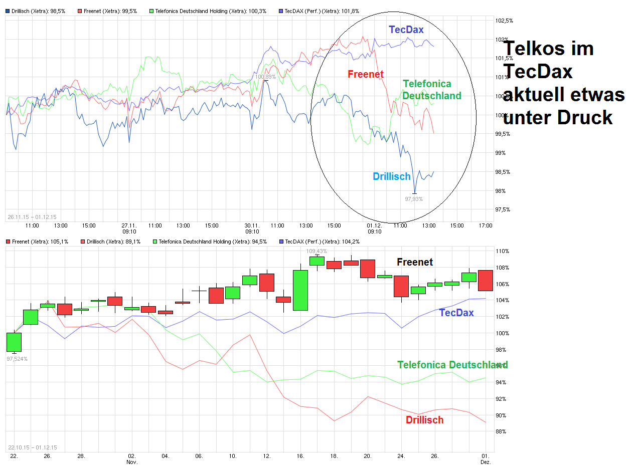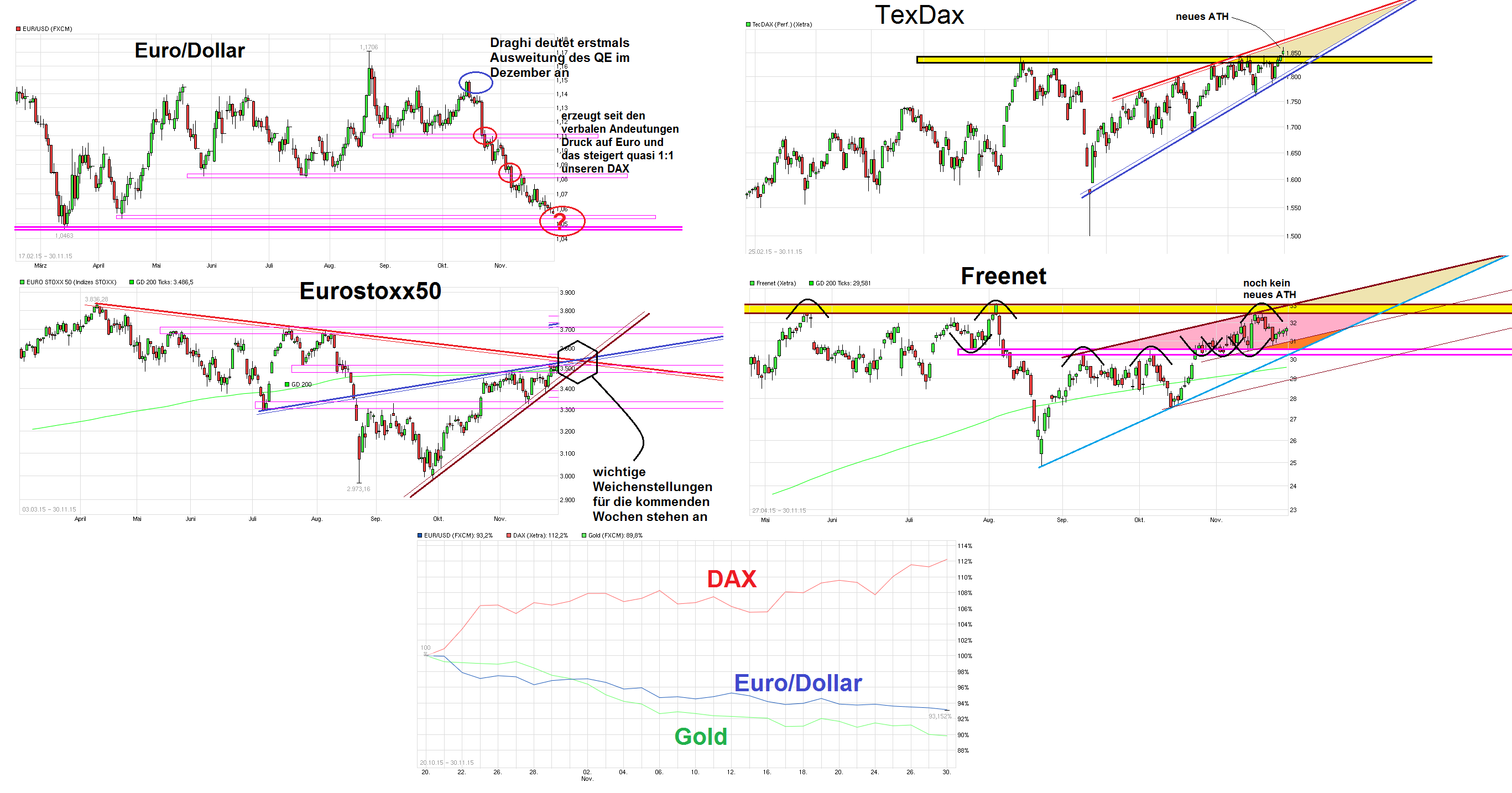 - Donnerstag 3.12. => EZB Meeting mit Aussagen von Draghi ob und wie QE ausgedehnt wird ( wird weiter nur der Mund unverbindlich gespitzt und nicht gepfiffen besteht Enttäuschungspotenzial für Aktien und Anstiegspotenzial für den Euro)