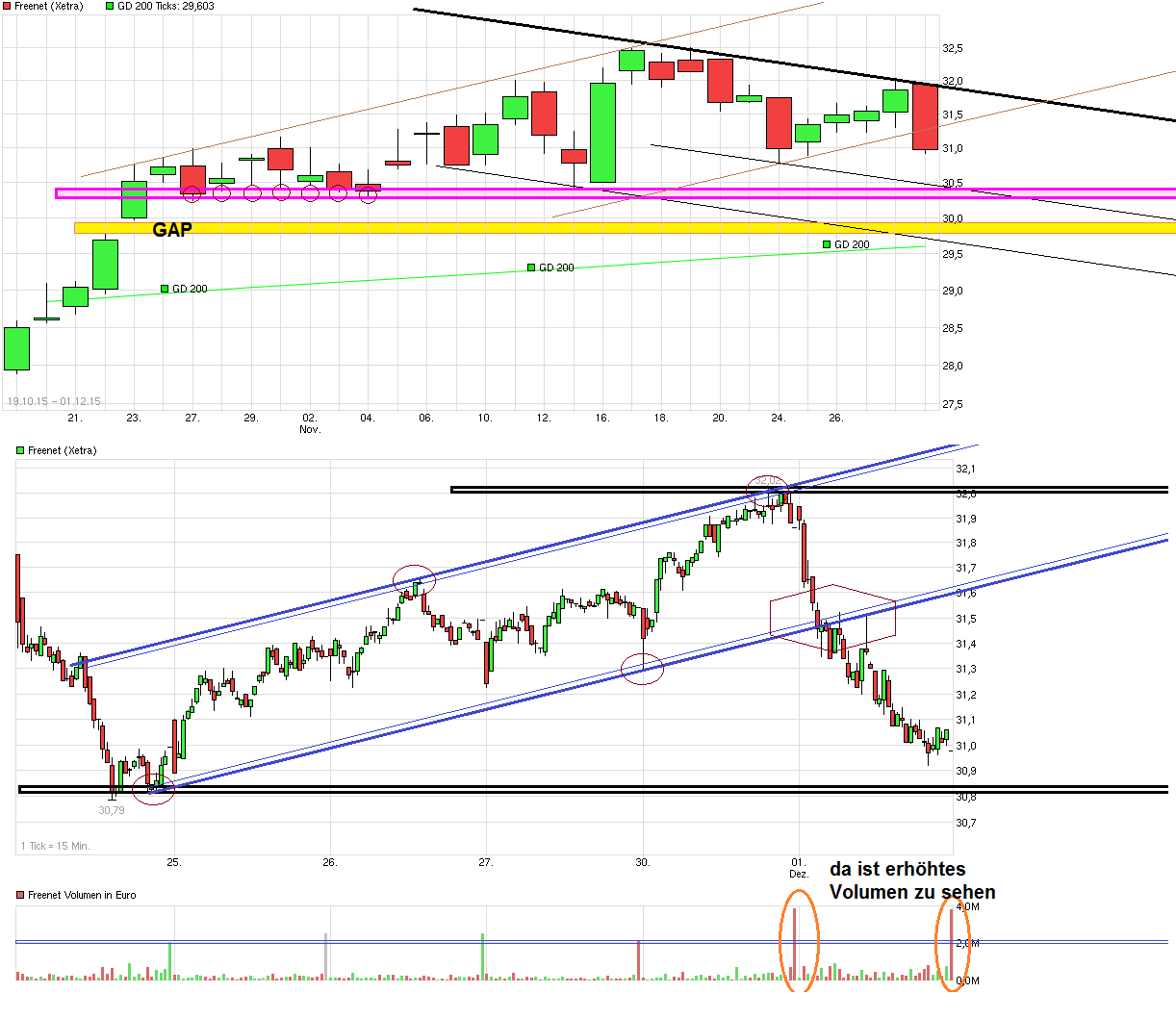 Tja, sieht so aus als würde sich zu Wochenbeginn fortsetzen was schon die Tage zuvor zu sehen war. Der Anschläge vom Freitag sind menschlich gesehen tragisch, objektiv gesehen aber ökonomisch doch wenig relevant. Jeder Flugzeugabsturz einer großen Verkehrsmaschinie verursacht wohl einen ähnlichen Schaden, bringt aber weniger mediale Aufmerksamkeit. Könnte vermutlich erstmal eine emotional bedingte Marktschwäche zum Start geben, um dann an gewissen Marken aber auch schon wieder zu stoppen bis zu denen man so oder so die kommenden Tage (besonders bis zum kleinen Verfallstag am kommenden Freitag) gefallen wäre. Man nähert sich weiter den vielen offenen Gaps die vom 22. auf den 23.10. entstanden sind. Im DAX / Eurostoxx wird man dann sehen, ob man eine belastbare Doppelboden-Formation ausbilden konnte in den letzten Monaten (Belastungstest der Nackenline) oder ob das nur eine trügerische Sicherheit zuletzt gab, daß hier die Konso der Vormonate abgeschlossen wurde. DAX hat es jüngst nicht geschafft den seit dem Jahreshoch fallenden Abw.trend zu überwinden, ist an der 200 Tagelinie nach unten abgeprallt und hat auch die Nackenlinie des Doppeltops von Juli/August nicht knacken können. Zudem war man zuletzt stark überkauft nach ca. 1700 Punkten Anstieg in nur 6 Wochen (was wie so oft schon kaum durch fundamentale Fortschritte entstand). Ausgangspunkt für diese Rallye war die Begeisterung über schlechte US-Arbeitsmarktzahlen und schwache Konjunkturzahlen in China Anfang Oktober. "Only Bad News Are Good News" gilt in einer Liquiditätshausse. Da fürchtet man nichts mehr als konjunkturelle Verbesserungen die dann Notenbanken dazu bringen könnten doch wieder das Gehirn einzuschalten anstatt immer weiter relativ nutzlose QE-Ausdehungen und künstliche Niedrigzinsen als einzige Instumente anzusehen die alles heilen sollen. Am 22.10. gab dann Draghi in dem brutalen Währungskrieg zwischen der Eurozone und den USA dem Affen verbal nochmal Zucker indem er QE-Ausweitungen in den Raum stellt ( www.faz.net/aktuell/wirtschaft/...aufprogramm-an-13870545.html ), die dann vom Markt sogleich dann schon für Anfang Dezember erwartet werden (und Euroraumaktien ab dem 23.10. ankurbelte) und den Euro gegenüber dem Dollar sofort extrem weiter schwächte. Von dem Zeitpunkt stammen ja die vielen offenen Gaps beim DAX (10508) und sehr vielen Einzelwerten (incl. FNT). Einige Werte hatten schon im Zuge der jüngsten Q.3 Zahlenverkündung "zufällig" in einer erster Reaktion genau bis zum Gap-Close nachgegeben, um ab dann "zufällig" sofort wieder zu steigen. Freenet hatte diese "Chance" jüngst vertan nach den Q.3 Zahlen. Daher könnte es vielleicht die kommenden Tage dann soweit sein mindestens die 29,79 nochmal zu sehen bei FNT, damit der Punkt unter "Common Gap" abgelegt werden kann. Das Problem ist ja, daß die jüngsten US-Arbeitsmarktdaten zu gut waren und jetzt die US-Zinswende doch schon im Dezember beginnen könnte. Steigende Zinsen sind ja etwas, was die jüngeren Börsianer noch nie erlebt haben ( => letzte Zinsanhebung der FED gab es 2006). Das hat natürlich dann den US-Börsen die Party die letzten Tage versaut, zumal ja jetzt auch noch der noch stärkere Dollar die Gewinne der internationalen US-Konzern belastet. Und da der Euro nach dem deutlichen Rutsch nach den Draghi-Äußerungen eher auf dem niedrigen Niveau um die 1,07/08 nun die letzten Tage seitwärts lief und damit den Euro-Aktienmärkten die letzten Tage keinen Sonderschub mehr gab, macht der DAX aktuell wieder alles sehr eng nach was Amerika macht. Also ich erwarte das Thema mit den Anschlägen wird an der Börse schnell verarbeitet (wie bei so ziemlich allen Anschlägen die nicht auf US Boden stattfinden) und dann zählt auch schnell wieder nur das was immer zählt: Erwartungen an Notenbanken, das was Notenbanken dann wirklich entscheiden, Konjunkturdaten mit hoher Relevanz für Notenbankentscheidungen (Inflationsdaten und Arbeitsmarktdaten) und natürlich Verfallstage ( je größer desto wichtiger).