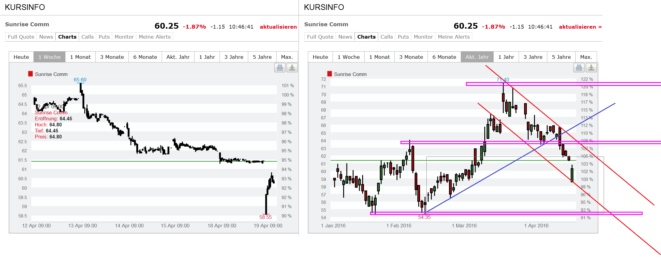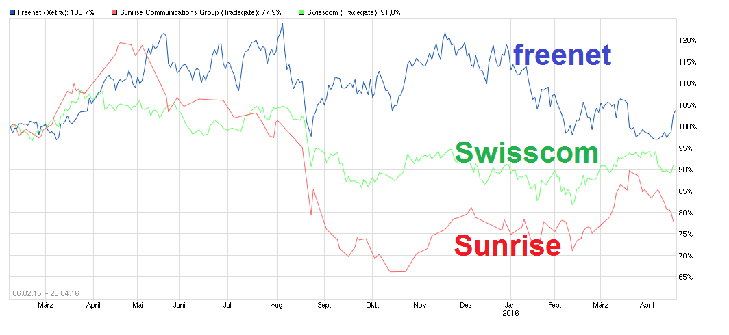 Ohne Sunrise stünden wir jedenfalls klar höher. Bleibt jetzt nur zu hoffen der Gesamtmarkt bleibt fest, Telkoaktien als Branche gefragt und Sunrise kommt aus dem Loch der jüngeren Zeit wieder raus. Die schweizer Netzbetreiber-Aktien sind jedenfalls auf Jahressicht Underperformer gegenüber dem deutschen Nicht-Netzbetreiber Freenet. Von daher hat vielleicht Freenet nicht nur einen zu hohen Preis bezahlt, sondern auch in den falschen Markt investiert. Also warum man es nicht als lukrativer ansah mit einem ARP kursförderlich in seine eigene Aktie zu investieren, die einer höhere DiviRendite hat als Sunrise, versteht wohl nur Preisig. Aber wenn ich sehe wie man mal eben über 700 Mio € fast spontan ausgibt für ein Finanzinvestment, dann hat das schon was von schlechter Comedy. Preisig erzählt ja, daß er zufällig jemanden traf und der ihn mal eben fragte, ob er nicht Lust hat einen Monsterbetrag auszugeben der Null Synergie hat zum Geschäft von Freenet, dem Verkäufer aber ein schöne Summe einbringt, weil der Verkaufpreis deutlich über dem Marktpreis liegt.