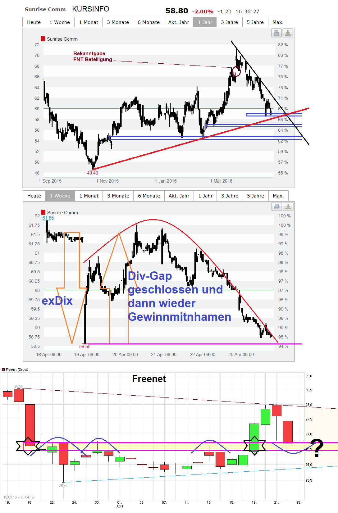 Also der Autor des Artikels will offenbar ganz bewußt nicht verstehen, um was es bei Sunrise/Freenet überhaupt geht und scheint in erster Linie auch nur mobilezone offensiv bewerben zu wollen. Freenet suchte doch keinen stragegischen Partner in der Schweiz, sondern wollte eine reine Finanzanlage ohne irgendwelche Synergiegedanken dabei. Genau das hat FNT x-mal schon deutlich hervorgehoben. Wer das nicht mitgekommen hat muß sich schon bewußt doof anstellen. Da war alleine der Gedanke, daß Sunrise so solide ist, um regelmäßig eine stetig leicht steigend Divi zu erhalten die eine gute DiviRendite liefert. SunriseDivi - Kreditzinsen = zusätzlicher Zufluß für den Freenet-Free Cashflow. Zudem braucht man diese Beteiligung wegen der geringen Beteiligungsgröße nicht in den eigenen Konsolidierungskreis aufzunehmen. Leider hat man sich offenbar bei FNT zuwenig Gedanken darüber gemacht, daß ca. 12% Prämie zum damaligen Börsenkurs für das Paket dann doch etwas heftig waren. Da war Preisig und Vilanek wohl etwas blauäugig in Punkto kurzfristigem Kursverlauf. Und wenn in dem Artikel steht "..Insofern bleibt die Frage, ob sich ein Engagement bei mobilezone aus strategischer Sicht nicht eher gelohnt hätte. Aus finanzieller Sicht auf alle Fälle, denn mit 400 Mio. Euro Marktkapitalisierung wäre mobilezone als Ganzes nur halb so teuer gewesen, wie ein Viertel von Sunrise...." ???????? Ist doch Nonsens dieser unpassende finanzielle Vergleich. Und wie hätte man daran eine große Beteiligung bekommen können an Mobilezone ohne den Kurs nach oben zu treiben oder einen Aufschlag an Großaktionäre zu zahlen ( wie bei Sunrise)? Warum sollte es sich finanziell also mehr lohnen, wenn die MK da bei 400 Mio liegt, die Bude aber auch vermutlich nicht mehr Wert ist? Die Frage ist doch was die knapp 25% an der größeren Sunrise mittel- bis langfristig wert sind. Welcher Aktienkurs wird sich besser entwickeln? Und wer von Beiden zahlt sicherer in Zukunft eine Dividende mit hoher DiviRendite? Wenn Sunrise als Firma den größeren Wert hat, dann ist es finanziell nicht schlechter sich daran mit "nur" 25% zu beteiligen anstatt bei der kleineren Firma zu 100%. Also auf mich wirkt der Artikel doch eher wie ein "selbstloser" Push, um damit Mobilezone jetzt Übernahmephantasie anzudichten indem man jetzt UI vorgibt als möglichen Interessent. ("....United Internet noch den mobilezone Joker spielen..."). Dabei dürfte UI eher bei Tele Columbus weiter ausstocken, um seine Stellung in Deutschland zu stärken. Und was steht am Ende des Artikels : "Der Autor, oder ihm nahestehende Personen oder Institutionen halten derzeit Aktien der oben genannten Unternehmen ..". Na dann ist ja gesichert, daß hier "objektiv" getrommelt wird ;) Wer ist den five-alive.ag? => Gegenstand des Unternehmens: Erwerb, Verwaltung und Veräußerung von Vermögenswerten jeglicher Art, insbesondere von Beteiligungen und Wertpapieren, ausschließlich im eigenen Namen und für eigene Rechnung zur Anlage des eigenen Vermögens. .." Aha, deswegen möchte man ungefragt anderen Leuten plakativ diese Dinge ans Herz legen und den Floh mit UI ins Ohr setzen ;) Also wenn man sich den Kursverlauf anschaut von Mobilezone und Sunrise, dann bekleckern die sich in den letzten Wochen beide nicht mit Ruhm.