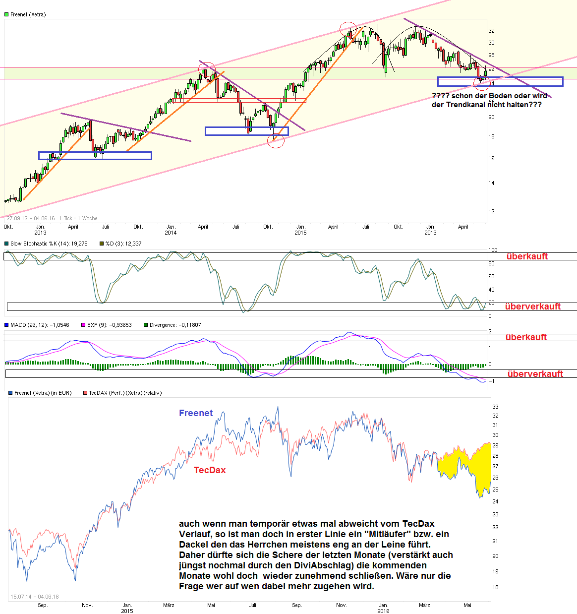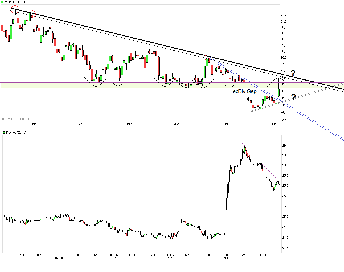 Stimmt, auf sehr kurze Strecke ist Freenet eher berechenbar, speziell wenn es um Gaps geht. Sunrise hat die letzten Tage angezogen. Von daher eigentlich etwas Gutes, wenn die 700 Mio € Beteiligung sich etwas erholt. Wäre noch die Frage wie der Wettbewerb in Deutschland den Providern das Leben wieder schwerer macht. Man schaue sich auch den Kursverlauf von Telefonica Deutschland an. Da Drillisch 500.000 neue Kunden p.a. braucht für Yourfone &Co und die in einem weitestgehend gesättigten Markt nur durch schärferen Preiskampf zu bekommen sind, könnte diese aggressiven Pumpingaktionen von DRI sich auf andere Provider auswirken. Entweder man macht ebenfalls viele Preisaktionen mit und drückt damit Marge/ARPU oder man verzichtet auf stärkere Neukundengewinnung. Bin mal gespannt wie dann die Hj.1 Zahlen und die weiteren Prognosen werden.