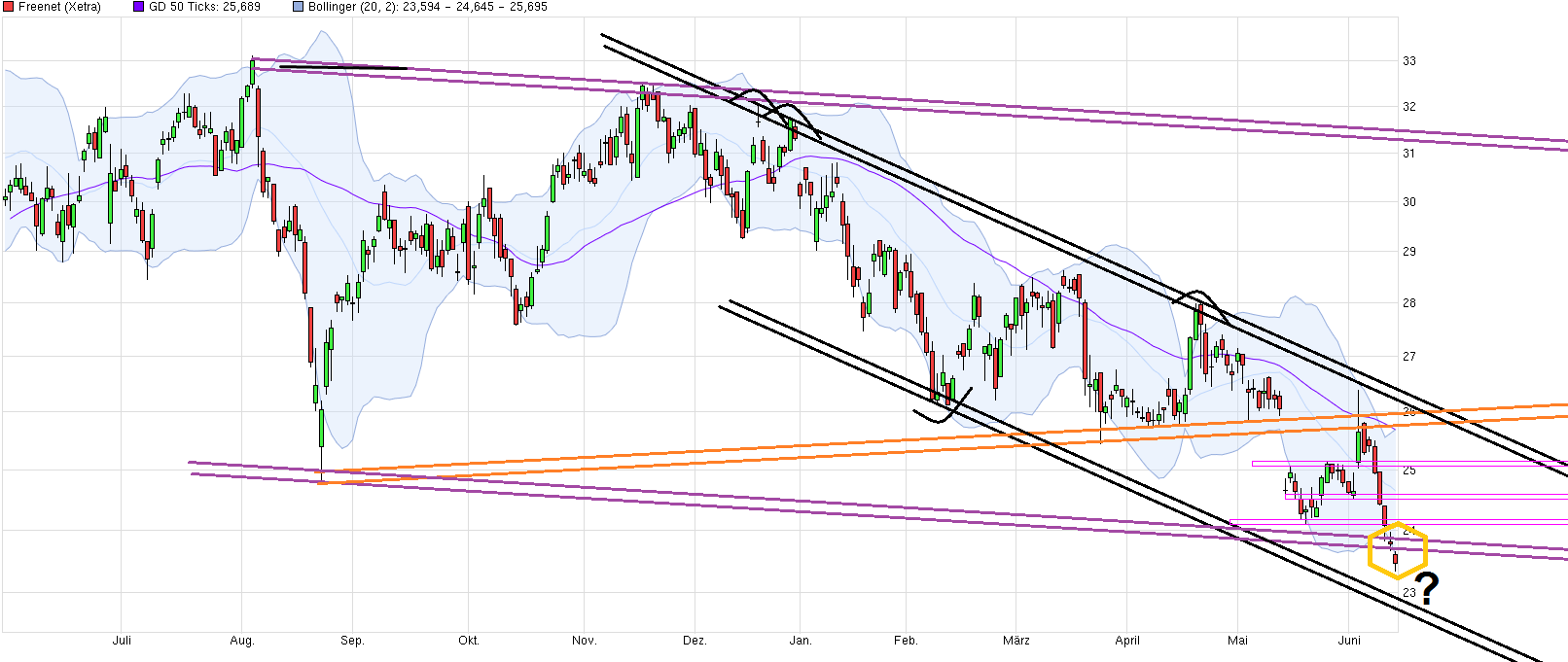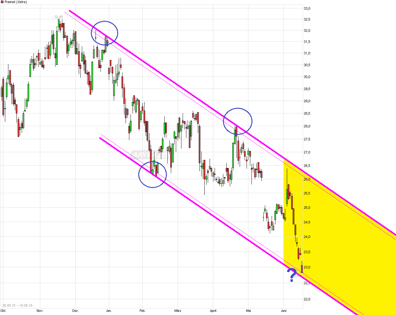 sehe ich ähnlich. Wobei man heute auch schon schon bei über 7% DiviRendite angekommen war (unter der Annahme 1,60 Divi bei 22,86€ genau 7% Divirendite => Tagestief heute 22,825). So langsam käme man auch in die Nähe der Unterseite des seit Herbst15 fallenden Abw.trendkanals. Letztendlich wird die Frage werden was am 24.6. passiert, wenn endlich Klarheit herrscht. Wenn die Briten gegen den Brexit stimmen sollten, dann kommt von der Seitenlinie wieder massig Geld in den Markt zurück. Ist aber aktuell eine 50:50 Sache, wenn man die Umfragen in England sieht. Von daher kann der Schuß auch nochmal nach hinten losgehen. Daher sind gestaffelte Teilkäufe nicht verkehrt, falls nochmal ein emotionales Zusammenzucken kommt nach einem Brexit, wo dann aber bald die Leute ( besonders die an den Börsen außerhalb von England) merken die Welt geht deswegen nicht unter. ( www.manager-magazin.de/lifestyle/artikel/a-1097964-2.html "... Ein Brexit würde auch dem Aktienmarkt heftig zusetzen - allen voran der Londoner Börse. Markus Herrmann, Chef-Analyst der Landesbank Baden-Württemberg, hält einen Absturz des britischen FTSE 100 von 30 bis 40 Prozent für möglich. Da es wegen der zweijährigen Übergangsfrist vor dem endgültigen EU-Austritt keine kurzfristigen handelspolitischen Konsequenzen gibt, sollte der Schock aber nur kurz währen, betont Finanzmarkt-Experte Jörg Rahn von Bankhaus Marcard, Stein & Co...."). Und auch bei FNT sollte man erstmal schauen was bei den Hj1. Zahlen rauskommt bevor man hier voreilig in Regionen zurückfällt die dem wahren Geschäftsverlauf nicht gerecht werden. Bei Telefonica Deutschland wird es auch langsam zu übertrieben. Und bei DRI muß man mal schauen, ob da genug "Wächter" an der 33,20 stehen, um hier nochmal ein weiteres abgleiten zu verhindern.