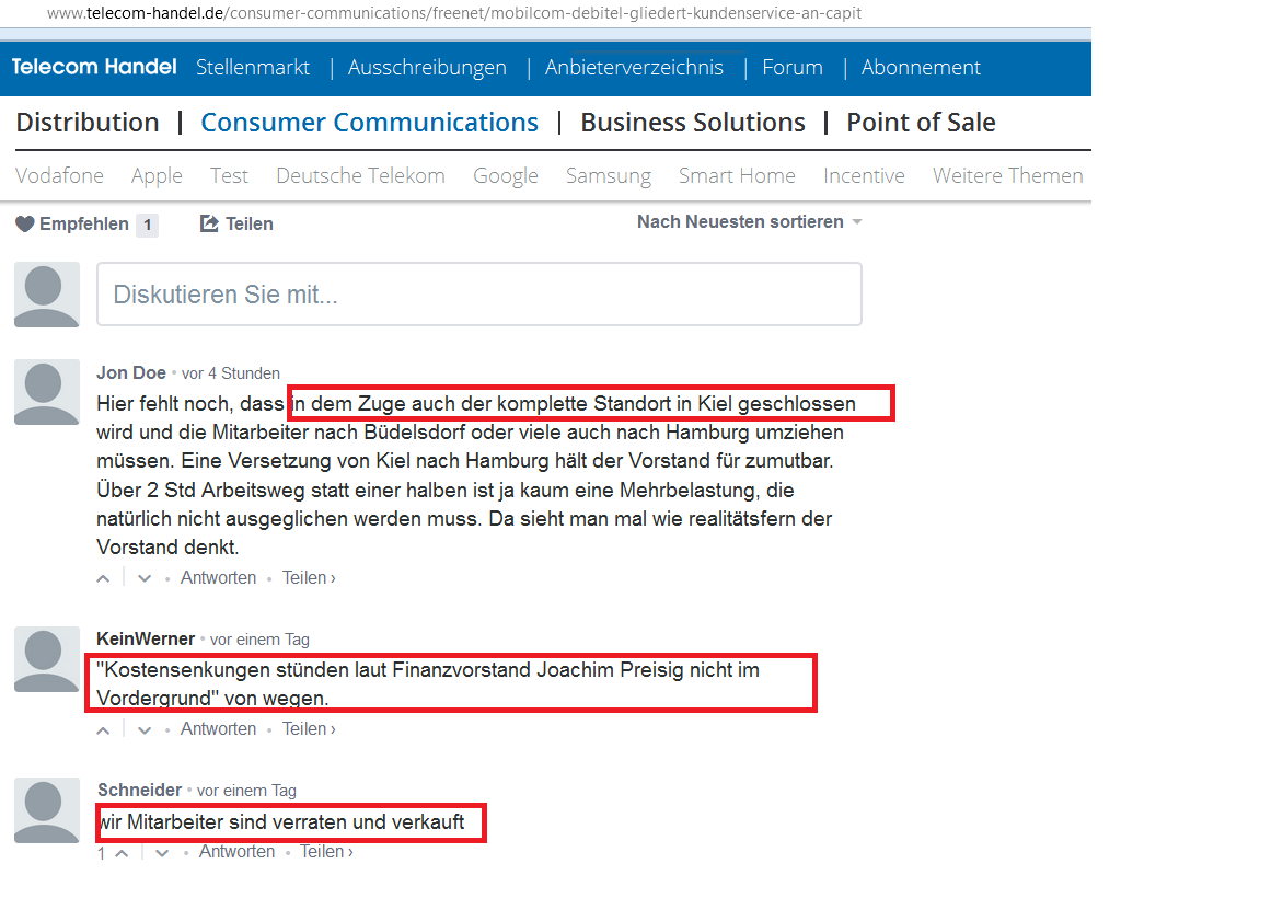 Ja, Kiel macht dann wohl auch zu. Na ja, Begründung ist sonnenklar, auch wenn man man offiziell wohl mal wieder zu feige war es offen auszusprechen. ( www.telecom-handel.de/...-kundenservice-an-capita-1168416.html "...Mobilcom-Debitel begründete die Ausgliederung gegenüber der Nachrichtenagentur dpa mit einer größeren Flexibilität. Kostensenkungen stünden laut Finanzvorstand Joachim Preisig nicht im Vordergrund. ..." ( ja, ja, und niemand hatte je die Absicht gehabt eine Mauer zu bauen) . Wenn seit Jahren eben umsatzmäßig beim Wachstum Flaute herrscht in der Mobilfunksparte oder man dann auch noch anfängt völlig überteuerte Beteiligungen an schweizer Unternehmen blauäugig zu kaufen, dann muß man eben versuchen den Gewinn in erster Linie zu steigern durch ständiges weiter anziehen an der Kostenschraube bzw. auf Kosten des Mitarbeiterstamms. Sind ja keine Menschen, sondern nur Zahlen die auf dem Zettel stehen. Und alle die jetzt bei FNT beschäftigt waren im Kundenservice habe nun das Problem, daß der neue Arbeitsplatz in einer völlig anderen Stadt liegt. Na ja, Hauptsache die millionenschweren Boni sprudeln weiter bei den selbstlosen Menschenfreunden Vilanek und Preisig. Was juckt die Jungs die Probleme der "Untertanen", was juckt die das Siechtum der Aktie durch ihre Zukäufe. 650 Leute also bald weniger angestellt bei FNT. Ersparnis nicht wirklich groß, da man nur die Leistung ankaufen muß. Zwar bedeutet so eine Outsourcing in 99% aller Fälle die Qualität des Service wird mieser. Aber Freenet ist ja ( ähnlich wie z.B. Ramschdiscounter Drillisch) eh nicht für besonderes Interesse an einem guten Kundenservice bekannt, da Service nunmal kostet und der Wettbewerb in erster Linie nurnoch über den Preis stattfindet. Wer beim Vertragsabschluß immer nur denkt "Geiz ist geil", der darf später dann auch nicht verwundert sein, wenn die Qualität beim Service nicht besonders glänzt, wenn man ihn dann plötzlich mal braucht.