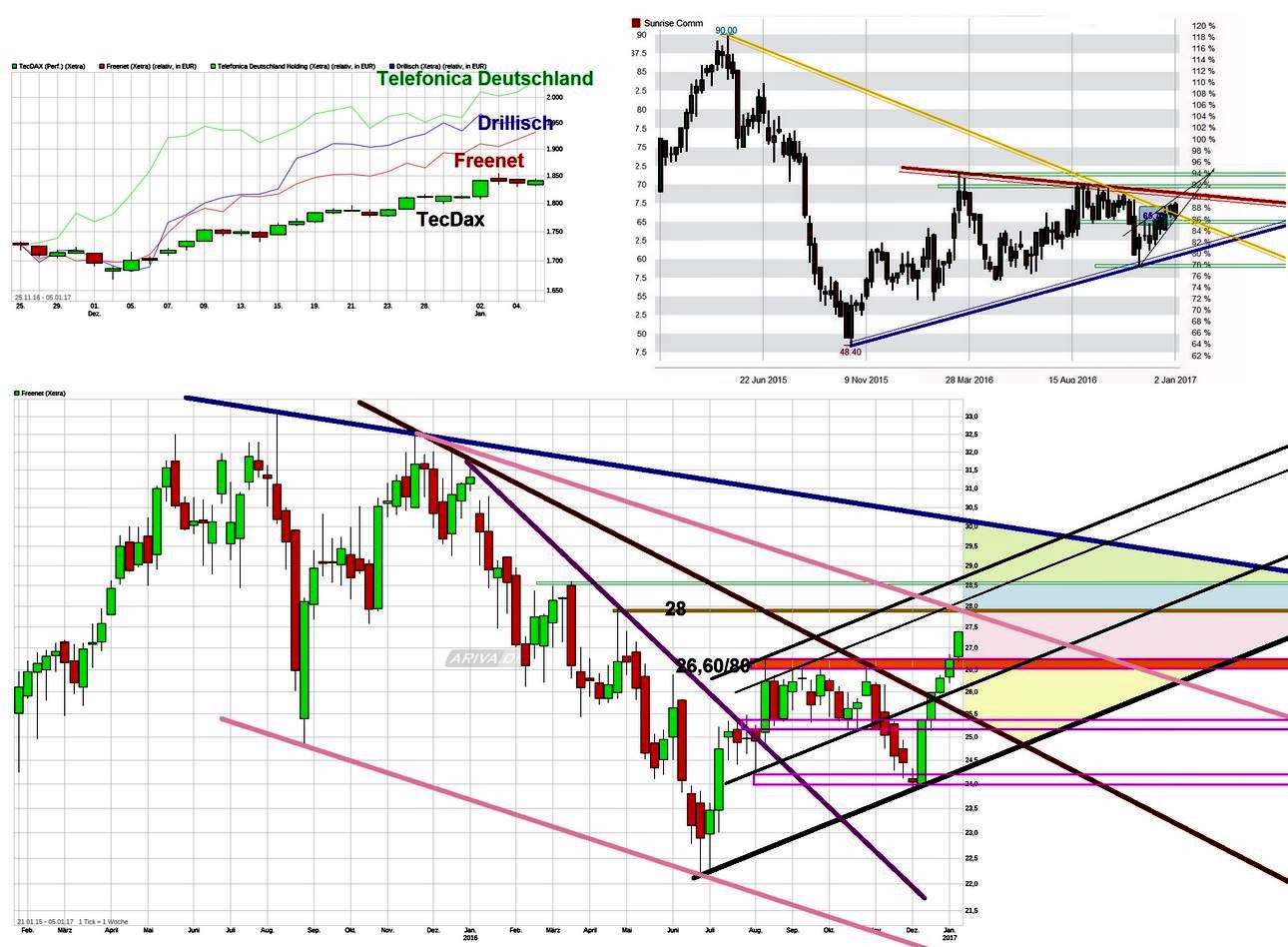 in der Nähe positionieren? Also bei dem Tempo der letzten Tage muß man ja mit allem rechnen ;) Na, vielleicht erstmal schauen, ob man sich stabil auf SK jetzt über der 27 halten kann. Für eine baldige 28 müßte wohl der Gesamtmarkt wieder mehr Gas geben als die letzten beiden Tage. Scheint die TelkoProvider bleiben allgemein momentan etwas gesucht. Man schaue auch z.B. parallel auf Telefonica Deutschland, Drillisch, etc. . Sehe da wenig individuelle Ursache bei FNT selber für den Kursanstieg. Der TV "Firlefanz" wird noch sehr lange eine Bagatellgröße darstellen. Im Kern ist FNT auch weiterhin ein träger Mobilfunkprovider der sehr viel Geld ausgeben hat für eine Beteiligung an einem anderen Mobilfunkprovider (Sunrise). Gemessen an den Ausgaben für die Sunrise Beteiligung waren die Investitionen in den TV Bereich deutlich geringer. Und da war der Hauptteil der Ausgaben ( ca. 300 Mio) der Kauf von Media Broadcast, was ja defacto ein biederer Laden ist, egal ob es DVB-T oder DVB-T2 gibt. Die leben in erster Linie von den festen Gebühren die die Sender jährlich zahlen für die Bereitstellung der Technik. Daher ist auch wichtiger wie sich der Kurs von Sunrise weiterentwickelt und wie die Investorenlandschaft ganz allgemein zur Branche steht. Da muß man bei den kommenden Geschäftszahlen wieder belegen, daß der ARPU mindestens stabil bleibt, die umsatzstarken Vertragskunden weiterhin hinreichen wachsen und dann einen Ausblick für 2017/18 geben der Luft nach oben läßt für den Kurs. Da die kommenden Monate bis zur HV Hauptsaison (Mai/Juni) die mediale Landschaft wieder traditionell zunehmend die Bedeutung von Divi überbetonen wird (um nach der DiviSaison dann kein Wort mehr darüber zu verlieren ;) ) könnte das die Nachfrage bei guten DiviWerten temporär/saisonal wieder erhöhen. Mancher Privatanleger/ Fondsmanger positioniert sich hier vielleicht lieber frühzeitig zum Jahresstart wieder etwas mehr in divistarken Branchen, die etwas im 2. Hj.16 zu kurz kamen, und baut etwas Werte ab, die schon Ende 2016 kursmäßig doch etwas überhitzt erschienen. Der Gesamtmarkt ist die letzten 6 Wochen brutal stark gelaufen und beim DAX ist die Region um 11670/800 auch keine weiche Butter die man mal so locker und schnell klar durchschneidet. Da könnte es auch sein man bekommt nochmal in den kommenden Monaten etwas Konso oder Seitwärtspendelei auf hohem Niveau geboten. Wichtig wäre bei FNT nicht mehr durch die alte Widerstandsregion 26,60/80 nachhaltig zurückzufallen. "Wunschziel" ( ja, ja, Börse ist kein Wunschkonzert) wäre Richtung HV/Q1 Zahlen sich weiter dem seit Sommer 2015 fallend Abw.trend deutlich anzunähern und mindestens an der 28 mal laut anzuklopfen. Ob jemand die Tür aufmacht wird man dann ja sehen ;)