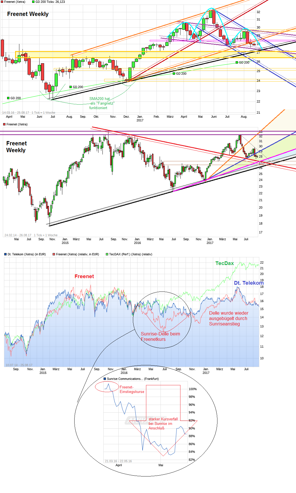Jetzt wäre die offne Frage welche Aufw.trendlinie weiter verteidigt wird und ob z.B. die SMA200 im Weekly Chart sogar nochmal als Fangnetz dienen muß. Wenn man nur aus reiner Divi-Sicht auf den Wert schaut und dabei allgemein TelkoWerte mit 6%+x DiviRendite als interessant ansieht und TelkoWerte mit weniger als 5% schon als nicht mehr interessant ansieht, dann wären unter der Annahme FNT liefert beim nächstenmal ein Divi von 1,65€ Kurse über 33€ eher teuer und unter 27,50€ doch wieder interessanter. Da steht man nun aktuell wieder sehr nahe an der Grenze zur 6% Marke. Somit eigentlich nicht ohne Reiz hier doch wieder einzusteigen mit Blick auf die nächste HV. Allerdings steht der wenig beliebte September jetzt noch aus, der im Durchschnitt der schechteste Börsenmonat ist ( => fs5.directupload.net/images/170826/mjqnp6qq.jpg ) und wo es vielleicht doch nochmal ein weiteres abtauchen des Marktes gibt ( sei es weil z.B. die US-Börsen doch noch die übliche Spätsommerkonso machen oder weil der Euro immer weiter fester wird gegenüber dem Dollar, was den Markt bei uns ziemlich 1:1 direkt immer runterbewegt). Zudem muß man auch schauen was ein Peer wie die Dt. Telekom kursmäßig weiter macht, da FNT sich auch stark nach der Performance der Branchenlokomotive orientiert, außer es gibt z.B. mal Sondersituationen wie letztes Jahr, wo temporär die Sunrisekursschwäche FNT deutlicher in den Keller gezogen hatte. Leider ist die FNT- Performance gegenüber dem TecDax seit einiger Zeit eine Underperformance (Divi-Abschlag berücksichtigt). Daher bin ich auch nicht in zu großer Eile bei FNT nun wieder die Position aufzubauen. Denke aber auch FNT bzw. Telkos werden wieder ihre Phase bekommen, wo sie mehr Gas geben können. Könnte aber eben sein, daß man u.U. dafür noch ein halbes Jahr wieder warten muß (Div Rallye-Saison). Sollte man in die Region 26,50/27,00 nochmal eintauchen in den kommenden Wochen bzw. diese Region tangieren, dann würde ich einen Kauf wieder in Erwägung ziehen. Schauen wir mal was kommt. Könnte auch damit leben es ginge vom aktuellen Niveau aus nicht viel tiefer und der sommerliche Boden wäre final im 27,xx Bereich gefunden. Dann würde ich mir aus Tradingsicht einen spekulativen Einstieg an einer Marke überlegen die man wieder als klares Kaufsignal deuten könnte. Bin da völlig flexibel.
