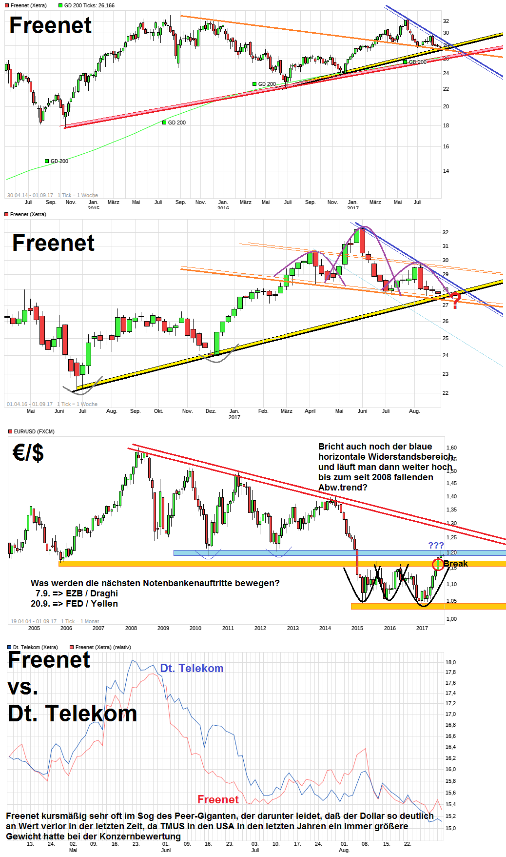 Am meisten schauen die Leute mit dem großen Geld wohl weiter nur auf Äußerungen/Erwartungen gegenüber den Notenbanken und die damit verbundenen Zins- und Währungsentwicklungen. Da scheint man (anders als noch vor wenigen Monaten) nun damit zu rechnen, daß die FED doch frühestens Ende des Jahres erst wieder den nächsten Zinsschritt macht und die von Obama berufene Yellen am Ende der Amtszeit in 2018 von Trump ersetzt wird durch einen Vogel der stärker sein Lied zwitschert. Und die EZB dürfte die Bundestagswahl jetzt vielleicht noch abwarten, um dann aber auch ab Herbst langsam aber sicher auf Tapering-Kurs einzuschwenken, weil der politische Druck zunehmend steigt und es seit langem schon überfällig ist. ( de.reuters.com/article/ezb-zinsen-sch-uble-idDEKCN1AV0CC "..Schäuble sieht Signale, dass es mit der ultralockeren Geldpolitik der EZB allmählich zu Ende geht. Die meisten Experten rechneten bereits damit, dass bei der nächsten Ratssitzung der Notenbank im September eine Entscheidung in diese Richtung fallen werde. ..."). Der sonstige mediale Rest ist weiterhin eher weißes Rauschen. Daher nicht von zwischenzeitlichen pseudo-poltischen Mätzchen ( z.B. Nordkorea und anderer Nonsens) kirre machen lassen, weil Aufbauschmedien wieder kurzlebige Säue durchs Clickbait-Dorf jagen, die natürlich auch von gewissen innenpolitischen Unannehmlichkeiten ablenken sollen. Fakt ist aber: Seit Anfang 2016, also in kaum 2 Jahren, sind die Börsen (zu?) rasant um weit über 50% anstiegen, seit der Wahl von Trump hat man nochmal die Bullen-Peitsche (übereuphorisch?) knallen lassen und die US-Kurse seitdem immer höher gejagt bis in Regionen, wo der S&P500 nun ein Mega-KGV jenseit der 18 hat (was ähnlich hoch ist ist wie zu den euphorischten Bubble Zeiten Ende der 90er). Die Notenbanken haben den Zenit der lockeren Geldpolitik auch überschritten und die seit über 8 Jahren stark liquiditätsgetriebene Gesamthausse könnte somit langsam in die Spätphase laufen. Von daher bin ich gespannt, ob man die Kraft nochmal finden wird eine nenneswerte Jahresendrallye hinzulegen und wenn ja, von welchem Boden aus. Besonders, wenn die US Börsen nicht im Spätsommer/Frühherbst vorher nochmal etwas mehr Druck aus dem Kessel lassen. Mein Wunsch an den Freenet-Kurs wäre ja weiterhin eher unspektakulär: bis zur nächsten HV das offene exDiv-Gap wieder schließen. Ob man es schafft und wo sich vorher der Boden findet zum Start dahin wird sich zeigen müssen.
