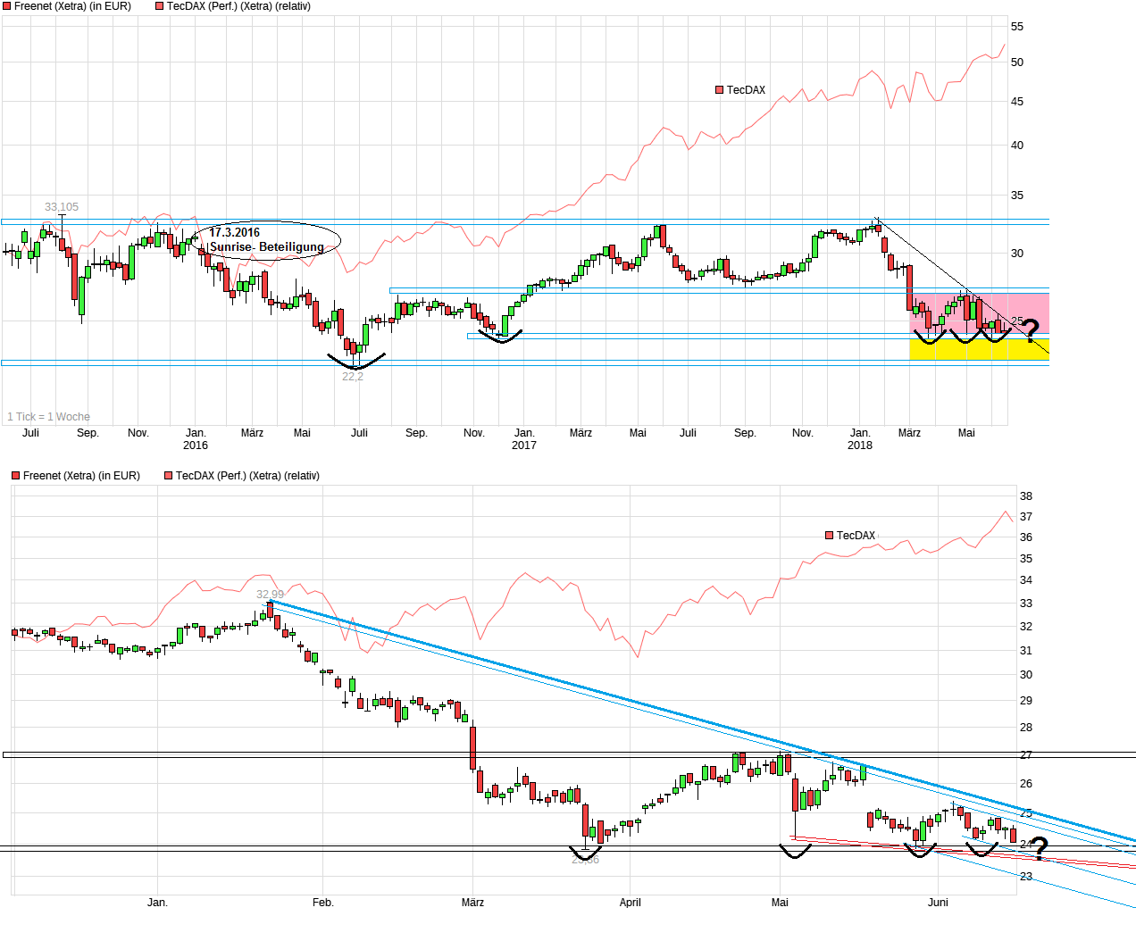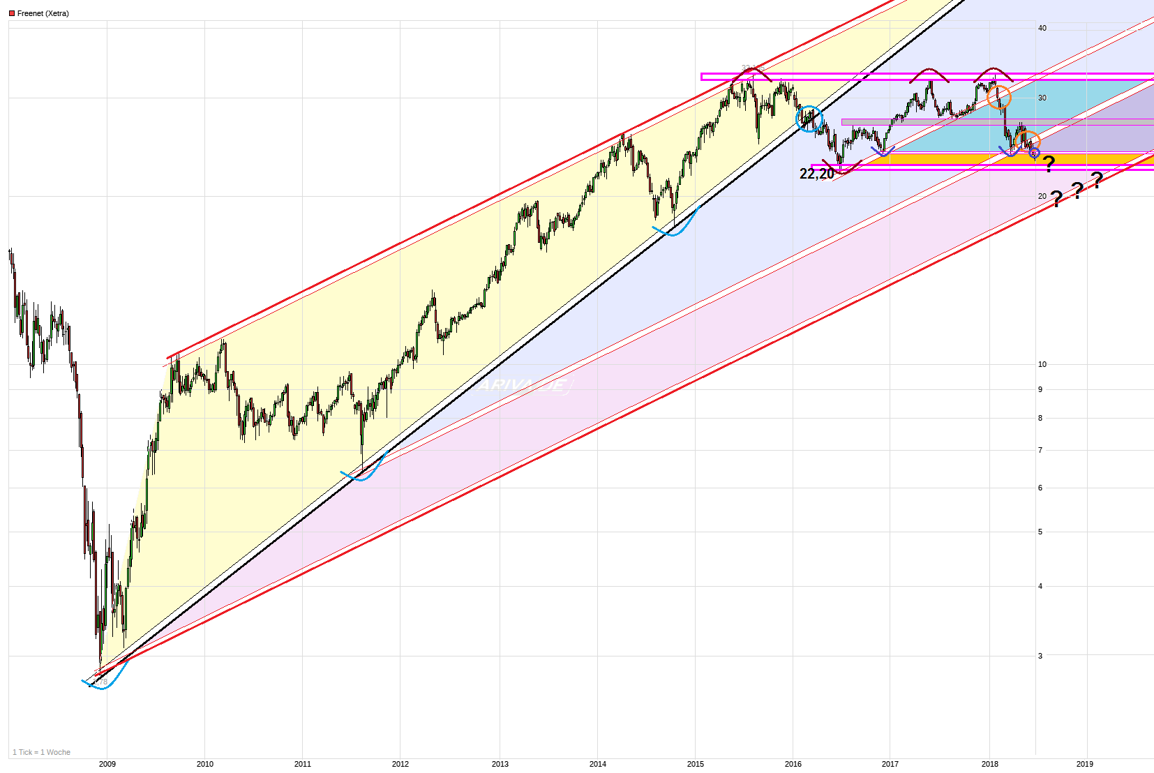 Nachdem man die letzten Tage ja vergeblich versuchte die jüngst gebrochene Widerstandsregion im Bereich von ca. 23,80/85 wieder zurückzuerobern und es lediglich zu Pullbacks kam die den Durchbruch bestätigten, ist man heute dicke 73 Cent vom Tagestop zum Tageslow gefallen und steht nur knapp über der 23er Marke. Noch 1 oder 2 solcher Tage und die wichtige Unterstützung bei 22,20 stünde auf dem Prüfstand. Ich hoffe natürlich man bleibt weiter in der großen "Schaukelrange" von ca. 22-33€ , aber wenn man unten auch da durchfallen sollte, dann könnte es nochmal eine weitere Verkaufswelle auslösen. Würde dann auch nicht ausschließen, daß für den Falle der Gesamtmarkt macht noch eine größere "Sommerdelle" ( was heute mit rauskippen aus der DAX Range von ca. 13150/200 -12550/600 drohen könnte) , man noch weiter hier nach unten übertreibt bei FNT , wenn vielleicht auch nicht so stark wie 2016. Von daher mal abwarten wie es hier weitergeht und ab wo es vielleicht dann dochmal großere instit. Vermögensverwalter so sehr in den Fingern juckt (angesichts der immer höher steigenden DiviRendite), daß man dem Kursverfall Einhalt gebieten wird. Angesichts der deutlichen Nähe zur 22,20 möglichst bald.
