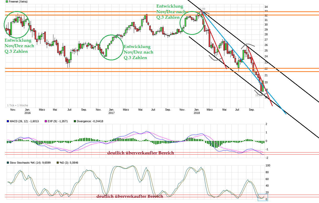 Saisonal gesehen wäre auch jetzt eher Käufer-Zeit bei Freenet, wenn man sich die letzten Jahre anschaut, wie die Kurse nach Bekanntgabe der Q.3 Zahlen bis Ende Dezember dann weiterlaufen. Wann waren die Kurse zuletzt in einem Jahr am 22. Oktober niedriger als am 31.12. ? (wobei das natürlich kein Kriterium sein darf sich nun in totaler Sicherheit zu fühlen, da Abweichung vom "normalen" Verlauf immer auch möglich ist). Die Indikatoren im Weekly-Chart sind bereits stark überverkauft und somit auch von der Seite techn. Erholung schon wieder überfällig wäre (wobei aber der MACD noch fallend ist bzw. keine Umkehr macht und somit ein wichtiges Kaufsignal noch aussteht ). Somit bin ich durchaus bei dir, daß Freenet gegenwärtig günstig erscheint und die Divi lockt. Unter "normalen" Umständen, d.h. keine tiefen Gesamtmarktabstürze oder Gewinneinbrüche bei Freenet, sollte Freenet Kurse von 22-24 stets mindestens zu rechtfertigen sein. Habe ich schon 2014 geschrieben, als man sogar unter 18 gefallen war. Sowas ist aber immer eine Einschätzung, wo man stetig im Auge haben muß was wirklich weiter passiert bzgl. des Mobilfunk-Marktes und der sonstigen Bereiche.