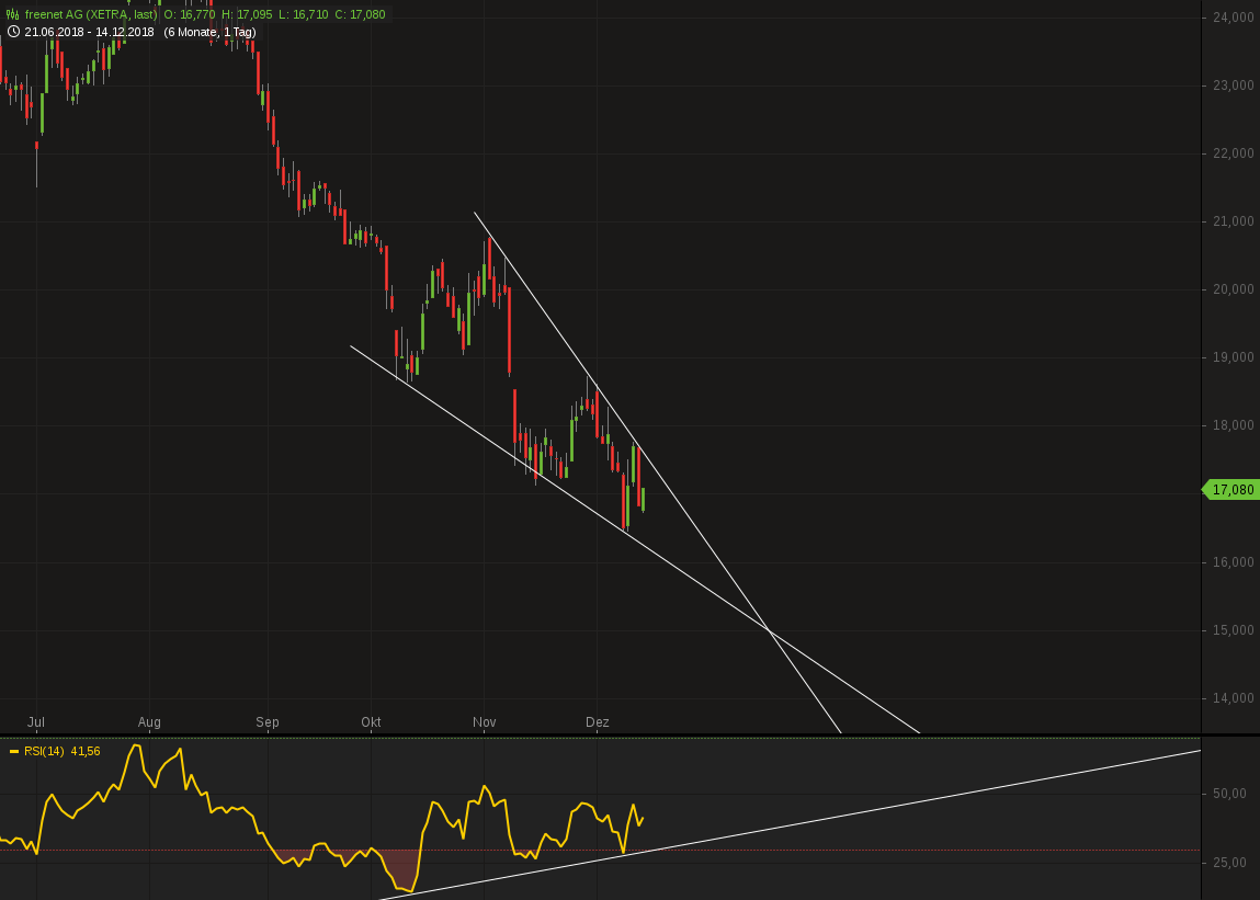 Montag, 10.12.2018 - 10:17 Uhr Alexander Paulus: FREENET – Neues Mehrjahrestief www.godmode-trader.de/analyse/...neues-mehrjahrestief,6684666 "...Sollte sich der Durchbruch durch die Unterstützung bei 17,12 EUR bestätigen, dann wäre ein relativ direktes Durchfallen in Richtung des rechnerischen Zieles aus dem Doppeltop bei 14,88 EUR zu erwarten. .."