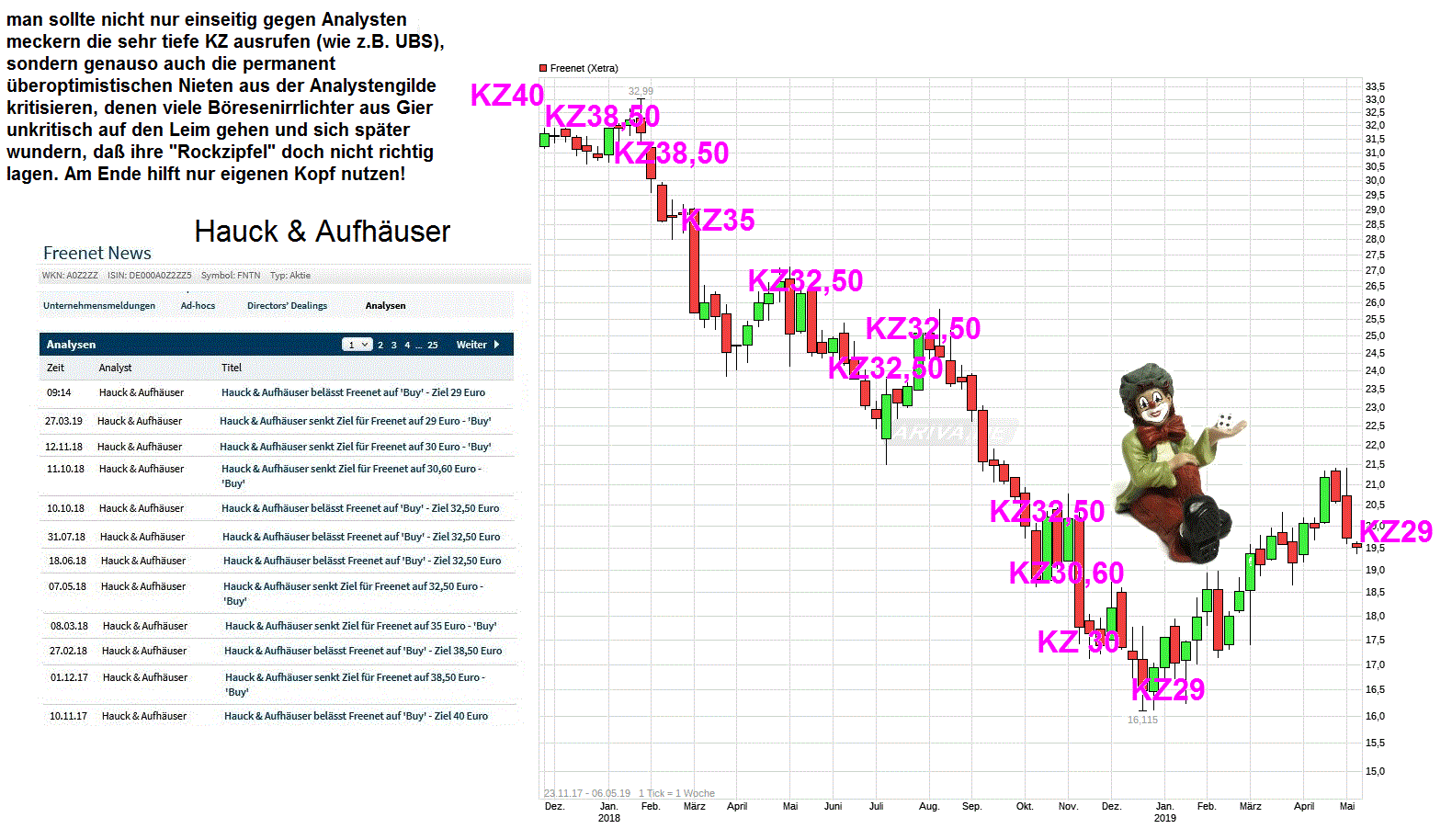 Bei Werten wie Freenet, die bekanntlich auch stark auch davon abhängen wie der Gesamtmarkt läuft, müßte man doch auch möglichst wissen wie die Gesamtbörse die nächsten 12 Monate läuft, wenn man schon ein KZ ausruft. Wenn die Börse crasht, dann steht der Freenet-Kurs auch bei gleichem Gewinn pro Aktie jedoch völlig anders als wenn die Börse nach oben davonfliegt. Analysten rufen aber ihre KZ immer isoliert im luftleeren Raum aus ohne diesen wichstigten Faktor zu berücksichtigen. Somit auch deswegen schon wenig nützlich. Wenn auch nur ein Analyst wüßte wohin die Börse genau geht, dann wäre er nicht ein kleiner Schreiberling bei irgendeiner Bank, sondern hätte damit Milliarden schon für sich selber gemacht und läge am Strand anstatt Kleingeldnarren weiter zu bespaßen. Der Einäugige bespaßt die Blinden. Wer sich auch nurmal etwas tiefergehend mit Analysten und deren deutlichen Mißerfolgsquote und nicht immer redlichen Motiven beschäftigt, der wird keinem Analysten mehr nachlaufen.