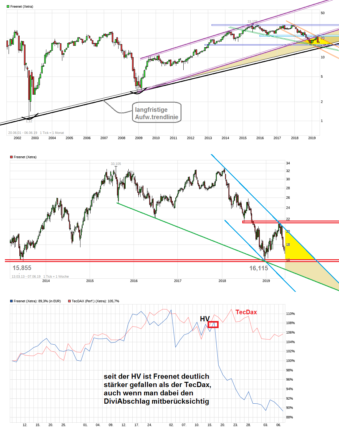 man will nochmal eine 16 vor dem Komma bekommen. Ob da wieder Leerverkäufer den Druck machen? Inzwischen nähert man sich schon fast der 5% Marke an bei der Anzahl der FNT- Aktien die von LV gehalten werden die jeweils mehr als 0,5% haben. Könnten auch weiter noch hinzugehören die unter der öffentlichen Meldemarke von 0.5% liegen. In der jüngsten Zeit ist zu dem LV-Rudel, was eh die letzten Monate so massiv schon aufgestockt hat, auch noch Marshall aufgesprungen. Ernsthaft abbauen von den Bestands-LV will offenbar auch keiner. Von daher müssen die LV ja noch irgendein Ziel auf der Unterseite vor Augen haben warum man weitere Posi aufbaut bzw. die bereits aufgelaufenen Gewinne nicht mitnimmt. Da Freenet schon seit vielen Jahren nach der HV bzw. exDiv immer sehr anfällig ist gegen deutliche weitere Rücksetzer ( alle DiviJäger gehen vorher rein/ hinterher will keiner mehr kaufen) verkaufe ich immer vor der HV, weil die Rücksetzer im Anschluß i.d.R. ein Mehrfaches des Divi ausmachen. In dieser Phase der Wochen nach der HV ist es also für LV eigentlich am leichtesten die Kurse zu drücken, da die Nachfrageseite klar dünner ist. Will man vielleicht nochmal die alten Tiefststände der jüngeren Zeit (16,115) antesten? Oder gar die 15,85 zum wackeln bringen? Oder einfach nur die längerfristige Aufw.trendlinie wenigstens erneut tangieren? (was ja auch kein Drama wäre solange man von dort dann aber wieder klar nach oben abprallen würde). Erwarten die LV weitere Rücksetzer im Zuge einer nochmal kommenden Schwäche der Gesamtbörse im Sommer oder rechnet man eher damit, daß Freenet auch bei den Q.1 Zahlen bzw. den Hj.1 Zahlen eher maue Zahlen bringen wird nachdem schon Q.1 nicht überzeugen konnte? Keine Ahnung was die im Auge haben als Ziel und ob die Gesamtbörse noch ins Sommerloch fallen wird. Halte mich jedenfalls mit einem Wiedereinstieg erstmal weiter zurück bis wieder eine bessere Signal&Nachrichtenlage zu erkennen ist und möglichst auch LV wieder reduzieren.