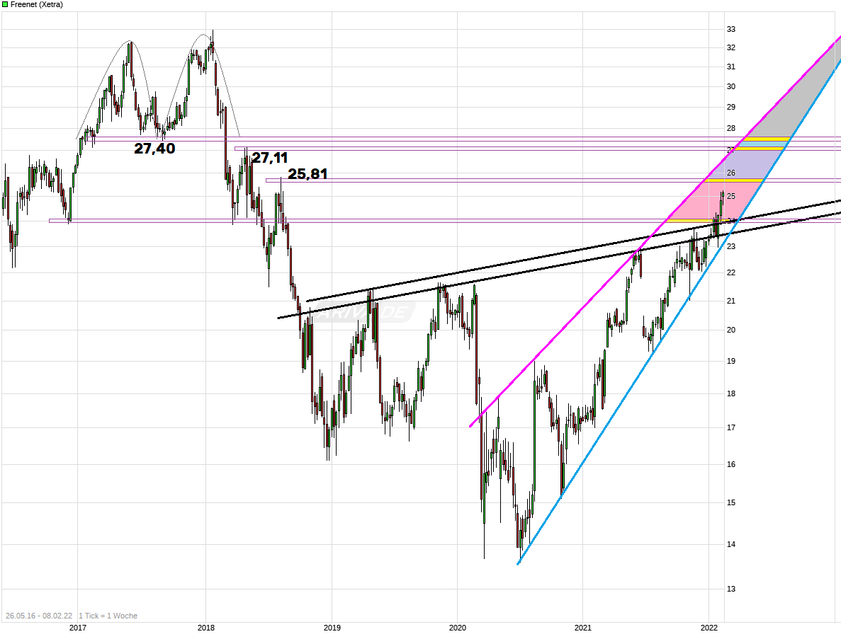 um dem Kurs bzw. der Bewertung auch gerecht zu werden. Dann hoffen wird mal es wird jetzt im Vorfeld der Zahlen nicht schon mehr eingepreist als dann mit den Zahlen geliefert wird. Also in den letzten Jahren hatte Freenet fast immer seine vorläufigen Gesamtjahreszahlen schon im Februar veröffentlicht. Wäre daher nicht verwunderlich, wenn auch dieses Jahr wieder ähnliches passieren würde. Die finalen / vollständigen Zahlen gibt es dann erst in der zweiten März-Hälfte. Interessant wäre natürlich zusammen mit den vorläufigen Zahlen auch schon den Dividendenvorschlag für die nächste HV zu sehen ( die dieses Jahr deutlich eher stattfindet als im letzten Jahr). Je nach Höhe könnte der ein oder andere Anleger erfreut oder verschnupft reagieren, da natürlich bei Freenet die Dividende immer stark im Fokus steht und in der Regel in den Vormonaten vor der HV auch als temporäre Anschubhilfe dient. Im letzten Jahr gab es 1,65 je Aktie (1,50€ für 2020 plus 15 Cent von der im Jahr zuvor von Vilanek fast vollständig unterschlagenen Divi für 2019). Ist 1,65 jetzt wieder der Maßstab der erwartet wird? Da in Q.1 2021 ja weistestgehend Lockdown stattfand und jetzt im laufenden Quartal kein Lockdown erlassen wurde, müßte Freenet im 1.Q.22 etwas bessere Zahlen haben, da eben nun wieder stärker Umsätze im stationären Bereich gemacht werden, wo bekanntlich die Marge bei Freenet besser ist als im extrem preisintensiven Online-Vertrieb. Vielleicht gibt man in der Meldung auch schon ein erstes Signal wie man in das Jahr 22 gestartet ist.