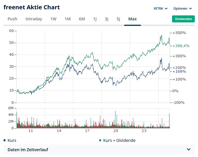 Und ohne da unangebrachte Panik schüren zu wollen, aber WENN von 27,-€ Kurs 3x 2,07€ Dividendenausschüttung zu 6,21€ (+x) Dividenabschlag führren und der Kurs nicht wieder steigt, dann ist das Ergebnis negativ. "WENN"