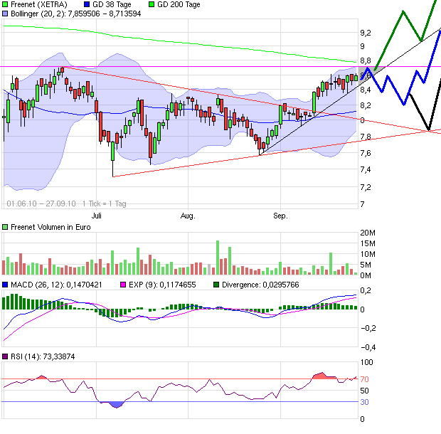 Rückblick: Über 2% konnte die Freenet Aktie im gestrigen Handel zulegen und war damit der größte Gewinner im TecDax . Trotz dieses Kurssprungs ist es den Käufern gestern jedoch noch nicht gelungen, die kurzfristige Range nach oben hin zu verlassen, in der sich die Aktie seit einigen Tagen befindet. Dabei konsolidiert der Kurs oberhalb der Unterstützung bei 8,30 Euro seitwärts.