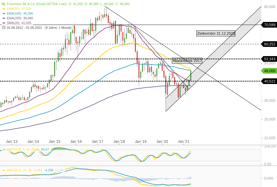 Die Aktie schaffte es nicht auf Anhieb den Widerstand bei 46 zu knacken. Dies war auch unwahrscheinlich, weil die Aktie den Dividendenabschlag zu verkraften hatte. Nunmehr gibt es ein MACD-Verkaufssignal und die Unterstützung bei 44 wackelt. Sollte die fallen könnte der Kurs nochmal auf 40 fallen. Spätestens dann würde ich wieder kaufen. Ich hatte mit der Spekulation um die Zerschlagung bei 46 verkauft, freue mich aber, dass die Zerschlagung nicht kommt. Weil ich FMC für ein Core-Investment von Fresenius halte. Dort liegen die Wurzeln des Unternehmens und diesen Zweig sollte man nicht verkaufen weil es vorübergehend hier nicht so läuft. Das wird schon wieder. Ich bin also froh, dass die Zerschlagung nicht kommt und denke, dass die Aktie langfristig wieder Richtung alte Höhen steigen kann. Wir haben eine sichere Dividende, stabile Gewinne trotz Corona mit Aussicht auf Wachstum. Obwohl die Gewinne seit der Finanzkrise um 200% gestiegen sind, hat die Aktie fast die Hälfte des Werts verloren. Der DAX markiert neue All Time Highs obwohl die Gewinne des DAX im letzten Jahrzehnt fast überhaupt nicht gestiegen sind. Fresenius ist aus der Mode gekommen und mit der Ablehnung der Zerschlagung geht das Geld, das nur noch dem kurzfristigen Momentum folgt und nur den schnellen Profit machen will, wieder raus. Soll mir recht sein, wenn ich nochmal günstiger reinkomme.