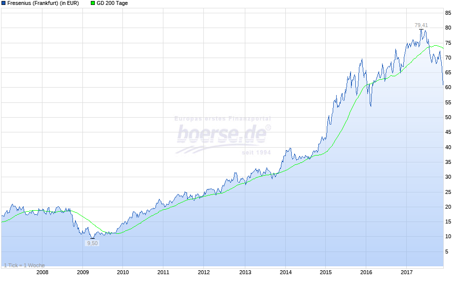Ich war in den letzten fast 20 Jahren schon in jedem Dax-Wert spekulativ investiert. Fresenius SE noch nie. Wie weiter oben bereits Markus* beschrieben hat, gibt es momentan auch nach meiner Analyse kein spezifisches Problem bei Fresenius, sondern eher im Sektor. Merck steht ähnlich negativ in 2017 da. Als defensive Werte sieht man solche Abstürze nicht all zu oft und für mich deshalb am Freitag mein erster Einstiegszeitpunkt mit ersten 33,33 %. Die Dividende ist tatsächlich im Vergleich nicht eben üppig, allerdings seit weit über 10 Jahren stetig steigend. Man muß sich nur die Gewinnentwicklung über die Jahre anschauen. Spricht eindeutig für diese Aktie und wenn es dann diesen Rücksetzer von 25 % seit Juni 2017 gibt, kann man mit erster Tranche spekulativ einsteigen. Mich interessiert die Dividende auch deshalb wenig, weil ich hier mit einem klassischen OS CALL eingestiegen bin und Laufzeit noch über 2 Jahre ist. Den besten OS-Schein gibt es nicht, kommt immer auf die individuellen Ziele an. Für mich war das ein Schein von der Coba