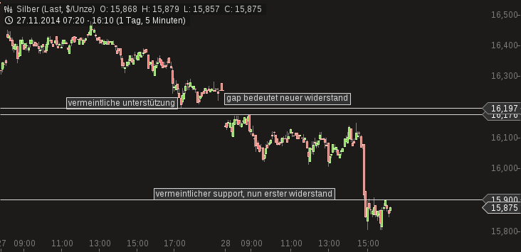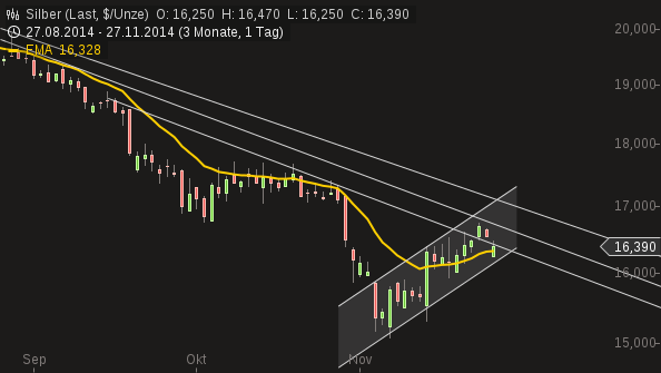 "....Anfangs sah es danach aus, als könnten die Notierungen die entscheidende Hürde überwinden, doch das Ansteigen bis 16,72 US-Dollar war noch nicht nachhaltig. Silber fiel zurück unter den Widerstand und muss wiederum mit dem kurzfristigen Aufwärtstrend kämpfen, der aktuell um 16,45 US-Dollar verläuft. Am Tagestief von 16,13 US-Dollar tauchten die Notierungen auch kurz wieder in den bisherigen Abwärtstrendkanal ein....Widerstand hält - Dieser befindet sich derzeit zwischen 14,70 und 16,20 US-Dollar. Gibt der Silberpreis das Anrennen gegen den Widerstand bei 16,64 US-Dollar vorerst auf, was bei Notierungen unter 16,20 US-Dollar angenommen werden kann, ... "