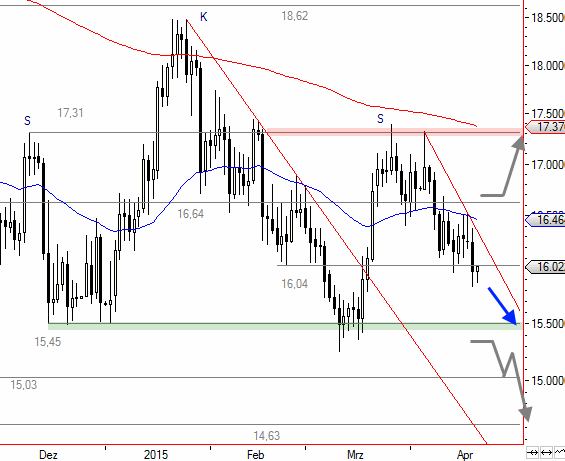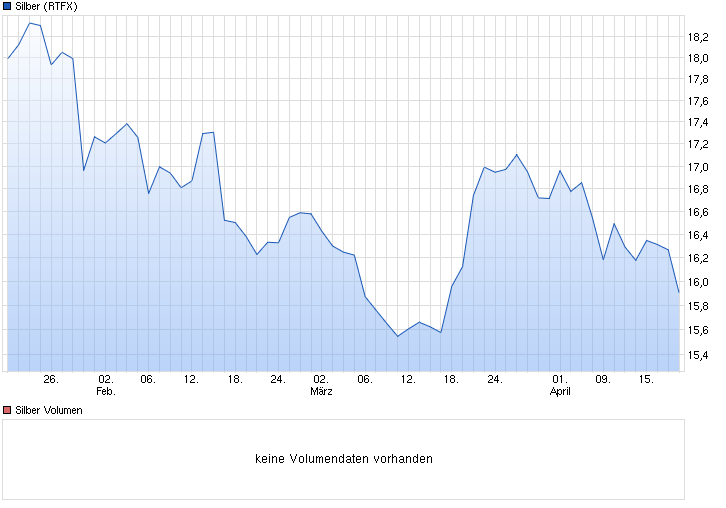 "Nach dem Rückgang bis November fand der Silberpreis um 15,40 US-Dollar einen Boden, den er in den letzten Monaten bereits mehrfach bestätigte. Nachdem ein erster Anstieg bis 17,31 US-Dollar führte, folgte ein zweiter Versuch bis an die höher liegenden Widerstände um 18,50 US-Dollar, doch beim bislang letzten Anstieg kam der Silberpreis erneut nicht über den Bereich von 17,30 bis 17,40 US-Dollar hinaus. Wie schon Mitte März sollte, wenn die Notierungen in den nächsten Tagen weiter zur Schwäche neigen, der Bereich um 15,40 bis 15,50 US-Dollar als Unterstützung halten. Von hier aus kann die Umkehr zu einem erneut steigenden Silberpreis folgen, dessen erstes Ziel an den oben beschriebenen Widerständen liegt, wo sich auch die 200-Tage-Linie bei aktuell 17,30 US-Dollar bewegt, ehe an das aktuelle Jahreshoch bei 18,48 US-Dollar gedacht werden kann. Unterschreitet das Edelmetall die Unterstützungen um 15,40 US-Dollar, können tiefere Anlaufstellen bei 15,03 und 14,12 US-Dollar liegen.....""