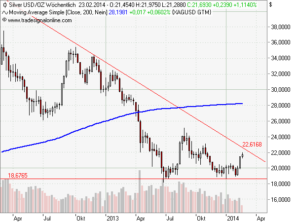 Nachdem es dem gelben Edelmetall Gold bereits Ende Januar gelang, den Abwärtstrend nach oben zu verlassen, trödelt das Gold des kleinen Mannes, Silber, dieser Entwicklung noch hinterher. Im Chart ist erkennbar, dass die rote Abwärtstrendlinie aktuell im Bereich um 22,60 US Dollar verläuft. Hier müßte der Silberkurs unbedingt rüber, um weiteres Potential auf der Oberseite zu erzeugen. Bis es aber richtig "grün" für den Silberkurs wird, dauert es doch noch ein ganzen Stück. So verläuft die 200-Tage Linie in einger Entfernung bei 28 USD.