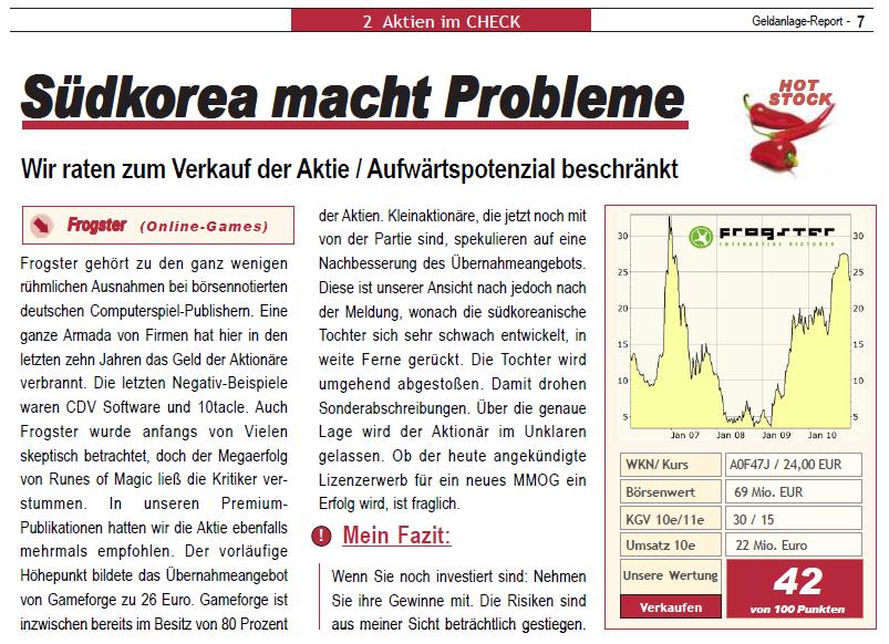 Karlsruhe, 8. Oktober 2010 - Die Gameforge AG besitzt 70,74 Prozent der Aktien und Stimmrechte an der Frogster Interactive Pictures AG. Am 16. August 2010 hatte die Rubin 66. AG, eine 100%ige Tochtergesellschaft der Karlsruher Gameforge AG, allen Aktionären von Frogster angeboten, ihre Aktien für je 25 Euro an sie zu verkaufen. Dieses Angebot erhöhte Gameforge am 13. September 2010 auf 27,50 Euro je Aktie. Die vorläufige Annahmefrist lief am 4. Oktober 2010 aus.