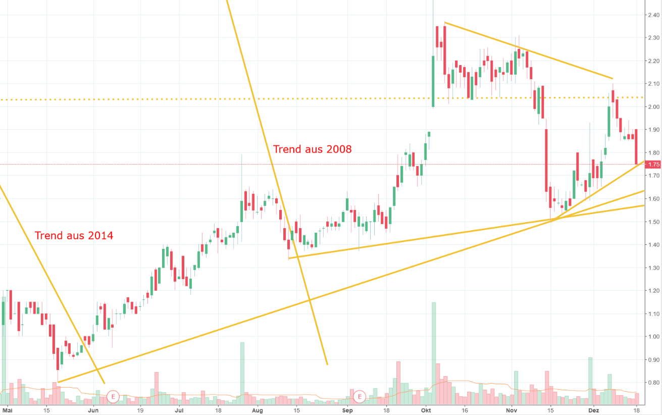 Ein Chartbild ist immer die Betrachtungsweise innerhalb eines Zeit-Fensters aus der Vergangeheit. Mit einem Chartbild kann mann nie und nimmer den Verlauf aus der Vergangeheit in die Zukunft hienein interpretieren. Ein Chartbild sind nur für die kurzfristigen Trader gedacht die solche Marken wie Widerstände und Unterstützungen ausnutzen. Hier liegt der kurzfristige Gewinn aus dem Verkauf und wieder Einkauf der Aktien. Der einzige der immer Gewinnt ist die Brokerbank mit seinen Transaktionsgebühren. Ich denke das ist eine Erfindung von Brokerbanken für Trader die ihr Geld wie auf der Spielbank verzocken.