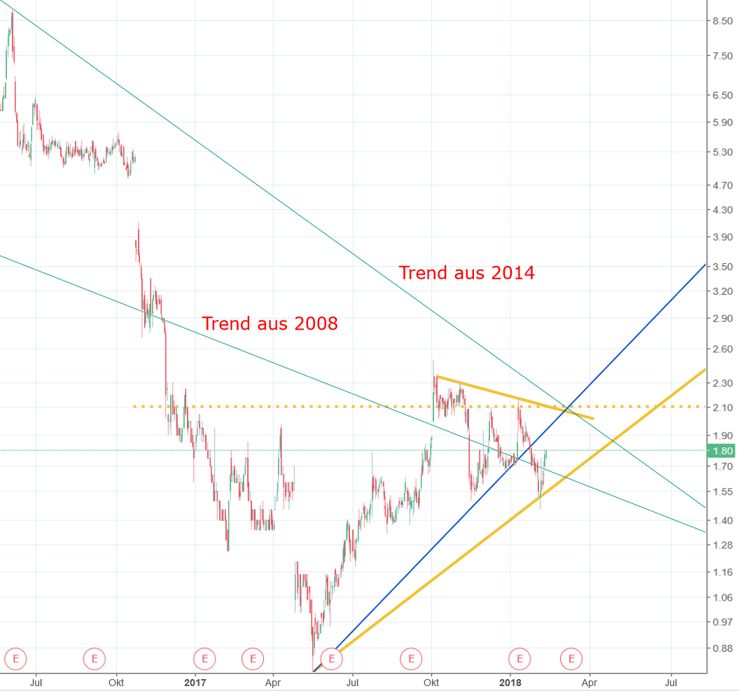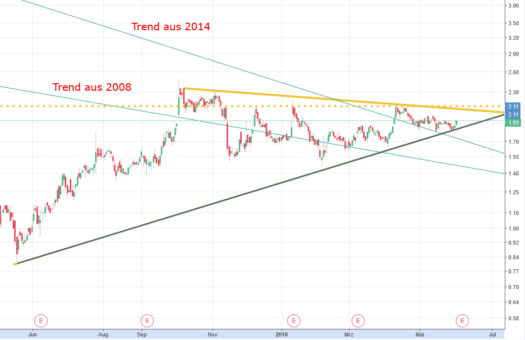 Ganz relevant dürften könnte nach wie vor die 2,10 USD sein, da nach dem LOG Chart hier noch der Abwärtstrend aus 2014 verläuft.