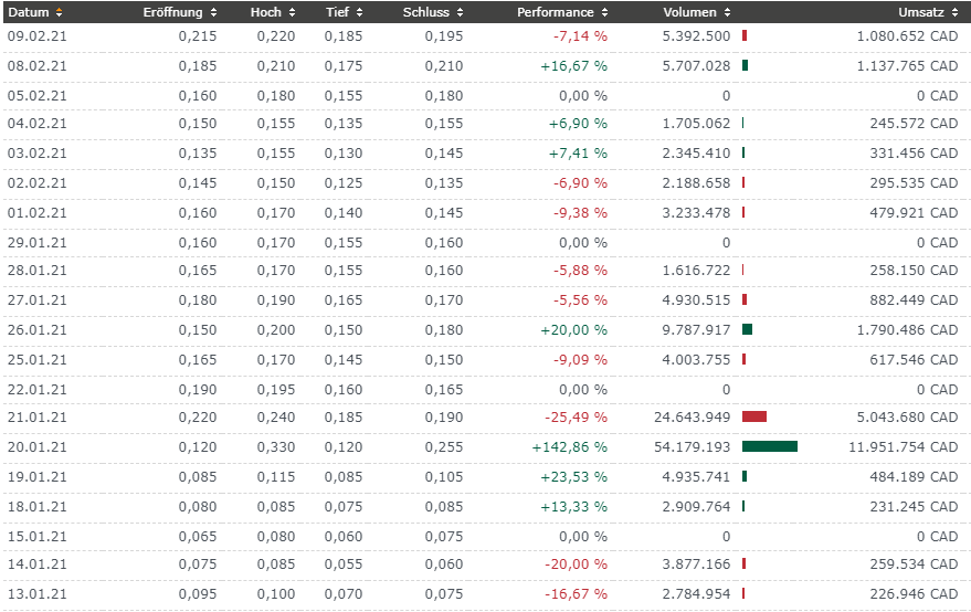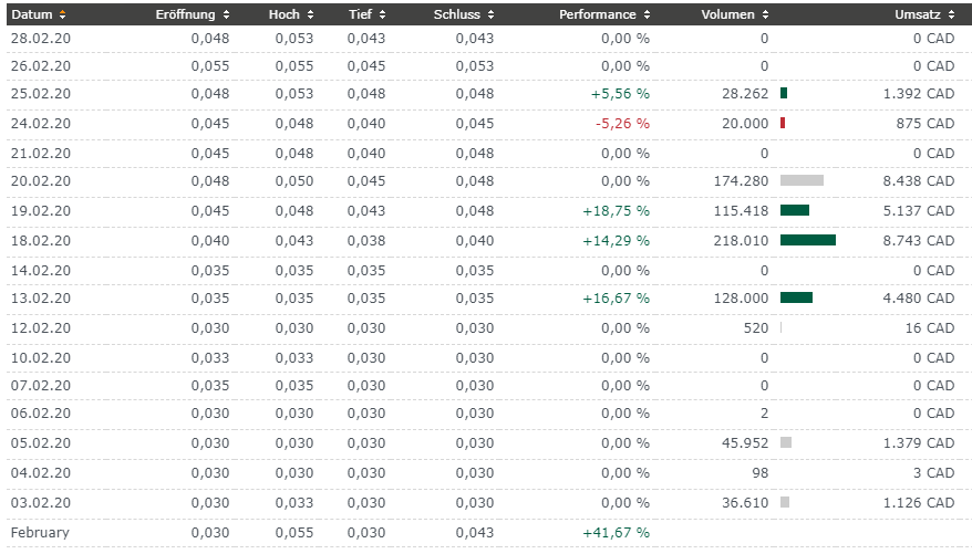 Hier die Umsätze an der TSX vor einem Jahr. Nur wenige Tausende CAD an Umsätzen. Nur wenige Aktien wurden gehandelt.