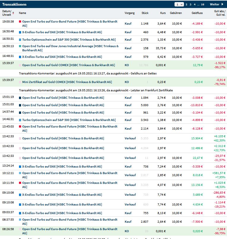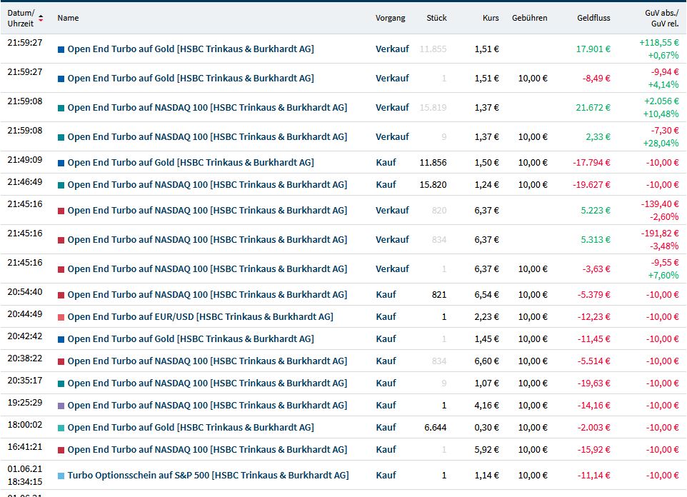 dabei habe ich beim Gold noch Glück gehabt, bin mit meinen überscharfen Hebeln beim braunen 168er praktisch am Tiefpunkt raus, den rest hab' ich mal drin gelassen ...
