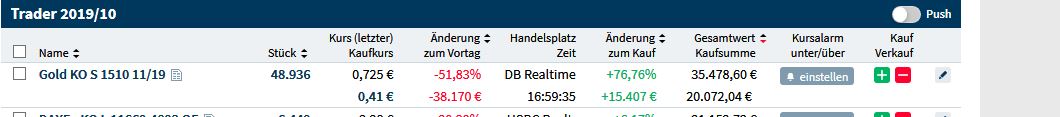 (rund 1,5% plus im geshorteten Basiswert plus ein KO im trader 10/19).
