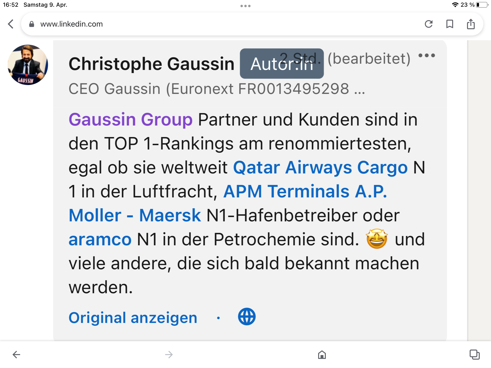 Sie sind immer noch in Gesprächen mit Aramco über einen Eintritt bei Gaussin, aber die Prozesse für diese Art von Operation sind langwierig.