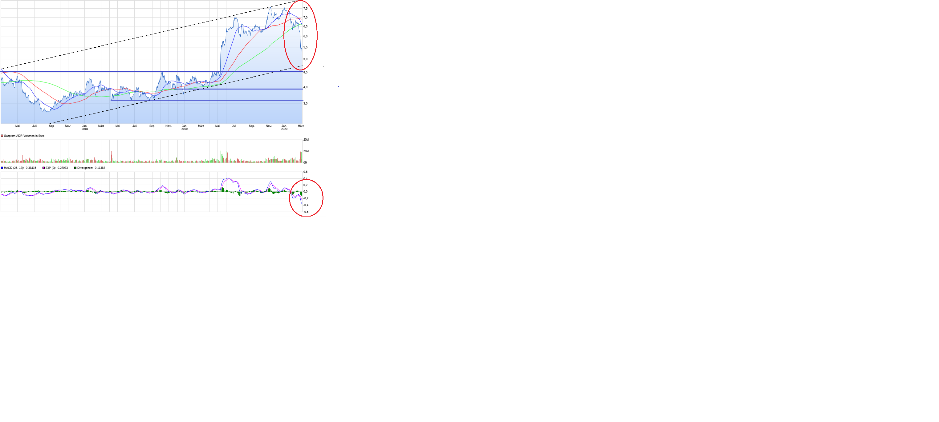 Auch die Gazprom-Aktie ist durch die Corona-Hysterie stark unter Druck geraten. Der Grund hierfür waren die sinkenden Ölpreise, die sich mittelfristig auch im Ergebnis des russischen Erdgasriesen bemerkbar machen (die Tochter Gazpromneft fördert vor allem Öl, zudem sind die Gaspreise bei vielen Lieferverträge an den Ölpreis gekoppelt). Die anhaltend niedrigen Öl- und Gaspreise dürften bei Gazprom für eher maue Zahlen im erste Quartal sorgen. Dennoch besteht kein Grund zur Panik, der russische Rohstoffriese sollte auch 2020 wieder hochprofitabel bleiben (mehr dazu lesen Sie hier). Indes stehen die Chancen gut, dass sich das angeschlagene Chartbild wieder etwas aufhellt. Im Zuge der jüngsten Korrektur wurde das im Zuge der Dividenden-Rallye im Mai 2019 aufgerissene Gap bei 5,85 Dollar geschlossen. Nun wäre es aus charttechnischer Sicht natürlich wichtig, dass auf diesem Niveau jetzt ein Boden ausgebildet wird und diese Marke tunlichst nicht erneut unterschritten werden. In diesem Fall wäre dann wahrscheinlich, dass dann auch die Ende Februar entstandene Kurslücke bei 6,48 Dollar geschlossen wird. Gazprom in US-Dollar Bloomberg Die mittel- bis langfristigen Aussichten für die extrem günstig bewertete Gazprom-Aktie bleiben gut. Solange sich bei den Öl- und Gaspreisen sowie im Gazprom-Chart selbst allerdings noch kein klarer Boden ausgebildet hat, drängt sich noch kein Kauf auf.
