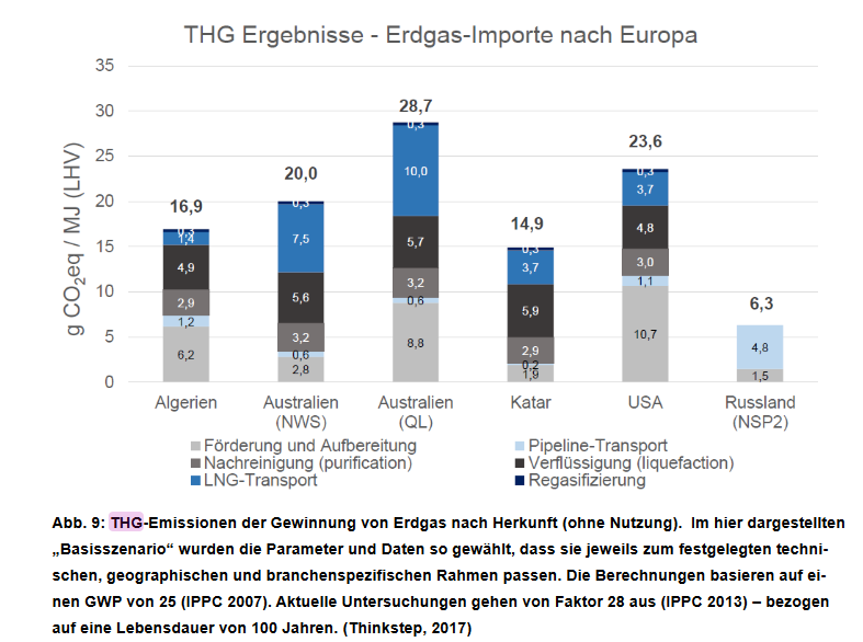 "Nach einer neuen Studie des Expertengremiums Energy Watch Group (EWG) trägt ein solcher Wechsel von Kohle zu Erdgas aber nichts zum Klimaschutz bei. Zwar stoßen Gaskraftwerke nur rund ein Drittel der CO₂-Emissionen von Braunkohlemeilern aus. Dafür geht auf dem langen Weg von den Gasfeldern zu den Kraftwerken einiges an Erdgas verloren. Dessen Hauptbestandteil ist Methan, das um ein Vielfaches stärker zur Erderwärmung beiträgt als Kohlendioxid. Damit wird der Klimavorteil bei den CO₂-Emissionen der Studie zufolge wieder zunichtegemacht. Unter Umständen seien Gaskraftwerke sogar deutlich klimaschädlicher als mit Kohle befeuerte Anlagen."