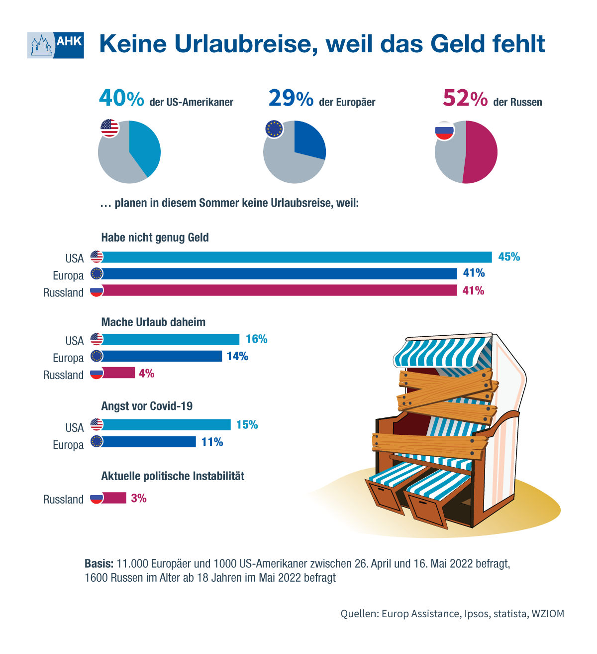 Diese Angaben stammen aus einer Konsumverhalten-Umfrage des internationalen Marktforschungsunternehmens Ipsos. Die Angaben in der obigen Grafik zu Russland stammen aus einer anderen Quelle. Gegenüber dem staatlichen Institut WZIOM gaben 52% der befragten Russen an, den Sommerurlaub „zu Hause“ verbringen zu wollen. Das ist exakt der Wert des Vorjahrs. 2012 bis 2019 lag der Anteil im Schnitt bei rund 45%. Auffällig ist, dass dieses Jahr 39% aller Befragten auch die Antwort (Mehrfachnennung war möglich) „auf der Datscha / im eigenen Garten“ wählten – so viele wie seit mindestens 2004 nicht mehr. Der bisherige Höchstwert war 34% (2018 und 2021), ansonsten lag der Anteil der Datscha-Urlauber meist bei knapp über 20%. Außerdem fragte WZIOM die „zu Hause“ Urlaubenden, warum sie nicht verreisen werden. Die offen gestellte Frage beantworteten 41% mit Geldproblemen, 1% mehr als im vergangenen Jahr und 12% weniger als 2019. Unter den gegebenen Antworten fand sich in Russland auch die „Instabilität bzw. Sonderoperation“ (3%), ohne Erwähnung blieb dieses Jahr die Pandemie. / Ipsos (EN), WCIOM (RU)