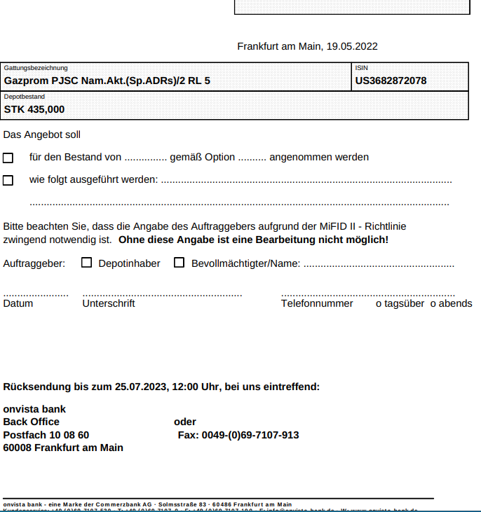 bei der Lagerstelle Citibank Moscow verwahrt. Bitte beachten Sie auch, dass wir keine Aussagen über die Erfolgsaussichten