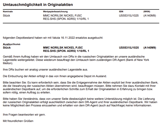 Der erste Teil unterscheidet sich erheblich. Mein Broker bzw. seine Depotbank überträgt lt Anschreiben AdR's zur Gazprombank. Ich soll ihm die Daten meines neuen Brokers angeben, damit die Gazprombank danach die Aktien dann weiterleiten kann (nach meinem Auftrag). BNY ist nirgends erwähnt und die wurden heute von mir informiert, dass die Bücher zu sind. Danach wurde trotzdem das Verfahren spezifiziert.