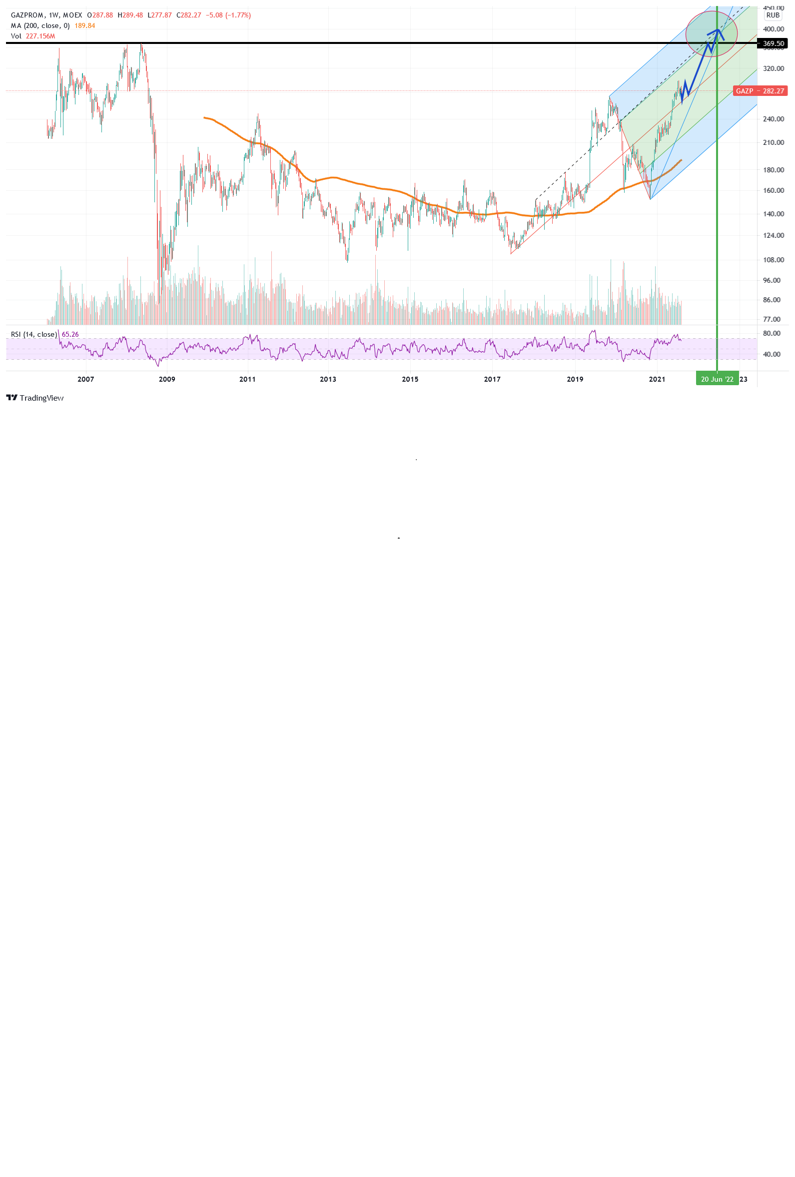 Als chartechnische Zielmarke lässt sich das ATH aus 2008 mit 369 Rubel ableiten. So oder so ergibt sich ein Ziel auf Sicht von 10-12 Monate im Bereich des ATH.