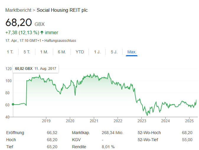 Da der Kurs seit 2020 sehr fix sehr hochgelaufen ist, stelle ich mich an der Seitenlinie auf. Mich interessieren solche REITS sehr, wobei dieser hier mit einer Marktkapitalisierung von GBP 453 Mrd im Vergleich zu Civitas Social Housing (GBP 670 Mrd) deutlich kleiner ist. Trotzdem: Das Unternehmensthema gefällt mir sehr und die Dividendenrendite ist mit momentan ca. 4,65% nicht zu verachten.