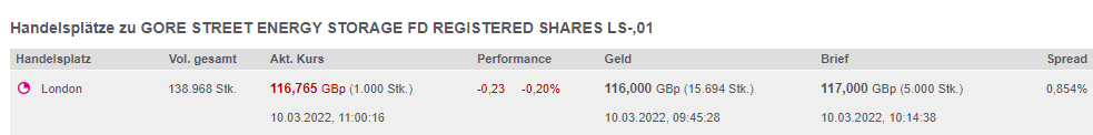 "Gore Street Energy Storage Fund PLC ist ein Unternehmen mit Sitz in London, Großbritannien, das primär im Bereich Wertpapierdienstleistungen tätig ist. Das Unternehmen wurde im Jahr 2018 gegründet und beschäftigte zum Ende des letzten Geschäftsjahres 0 Mitarbeiter. Die größten Anteilseigner sind Rathbone Investment Management Ltd., EFG Private Bank Ltd. und National Treasury Management Agency (Invt Mgmt). Der Umsatz des Unternehmens betrug zum Ende des letzten Geschäftsjahres 1.23 Mio. GBP mit einem Gewinn von 14.59 Mio. GBP. Der Umsatz hat sich gegenüber dem vorherigen Geschäftsjahr um 34.7% vergrößert. Die derzeitige Marktkapitalisierung beträgt 400.24 Mio. GBP. Die Angaben zum Geschäftsjahresende beziehen sich auf den 31.03.2021. Die Sektorklassifizierung des Unternehmens basiert auf dem FactSet eigenen RBICS Sektorsystem."