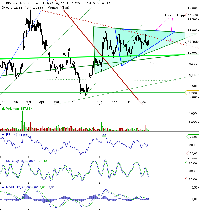 nobbese65: Aktuell gute Kaufchancen, wenn's tatsächlich auf 9,50 Euro runterläuft. Noch weniger = doppelte Kaufchance. Nicht mehr und nicht weniger. Man wird auch erst etwas sagen können, wenn wenigstens bei uns in DE klar sein sollte, ob Gelder seitens der Regierung für Infrastrukturen bereit gestellt werden, mal unabhängig von den guten Erfahrungen in vs. Auslandsmärkten, wie den USA. Alu-Zyklus war auch lange Zeit nicht, Stahlwerte in den USA ziehen aber an; jedenfalls auf der anderen Seite des Atlantiks. Das gilt auch für Rohstoffproduzenten dort. Also, auf Dauer lässt sich das ja nicht verheimlichen, deshalb plädiere ich für baldige Käufe bei diesem Rohmaterialienhändler, der offenbar seine Kosten nunmehr im Griff hat, wie Barrick Gold das ja auch schaffte. Man kauft dann, wenn's keine/r merkt. Nach dieser Devise kann man (.. konnte man) schon viel Geld verdienen. 2014 wird's allemal schwerer noch die richtige Auswahl zu treffen. "Kurssprünge wie in diesem Jahr von deutlich mehr als 20% gibt es nur einmal im Jahrzehnt". Das sagt jedenfalls Ewen Cameron Watt, der Chefstratege von BlackRock. Nun hat KlöCo diesen Kurssprung geschafft, ... immerhin von 8,15 Euro ausgehend. Da fällt mir also ein weiteres Investment in KlöCo SE leicht, .... so jedenfalls meine Meinung.