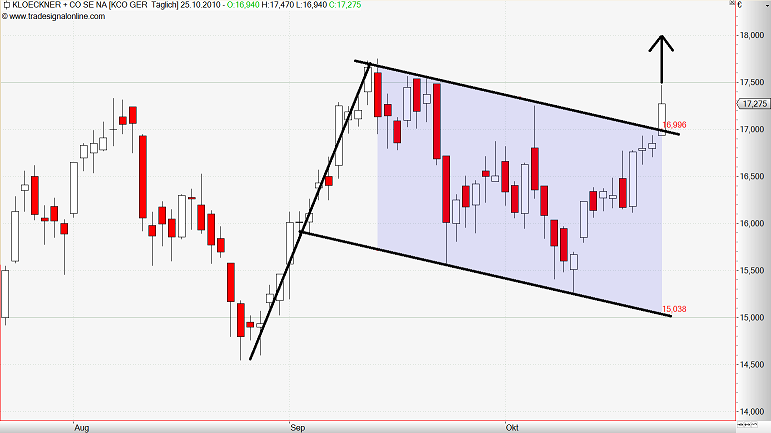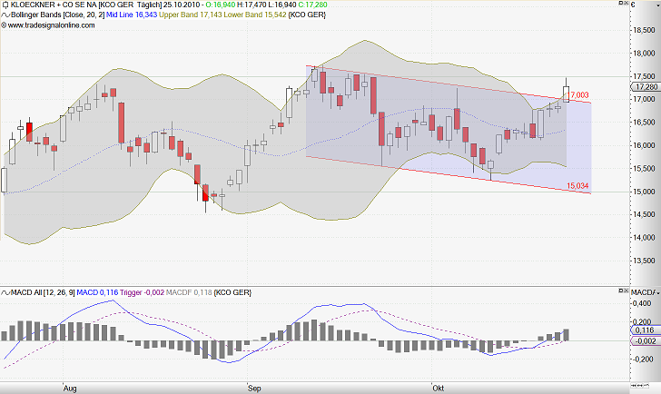bin seit letzter woche investiert, da klöckner fundamental unterbewertet ist (aber natürlich auch ein hochvolatiles geschäftsfeld hat), ich denke die zeiten des günstigen einkaufens sind praktisch vorbei, wer unter 17€ eingestiegen ist, sollte sich nicht von stärkeren schankungen beeinflussen lassen, sondern dabei bleiben, auch rücksetzer bei der bekanntgabe von zahlen dürfen einen nicht wundern (hat mich bei diversen tecdax aktien viel nerven gekostet)