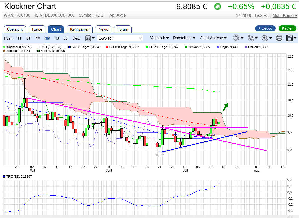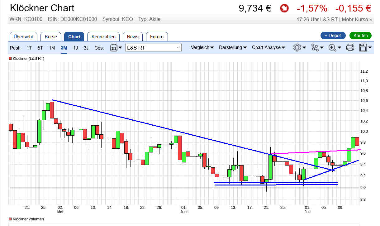 gestiegen, daß ich nirgendwo mehr eine günstige Einstiegsgelegenheit finde. Gestern wollte ich Klöckner in Südzucker tauschen, aber ich kam bei Klöckner nicht mehr heraus. Ich sah wie schwach diese Aktie war. Als ich Klöckner verkaufen wollte, ging der Kurs sofort nach unten. Gestern hätte ich Südzucker noch zu 18,10 € bekommen. Heute stehen diese Aktien bei 18,53 €.