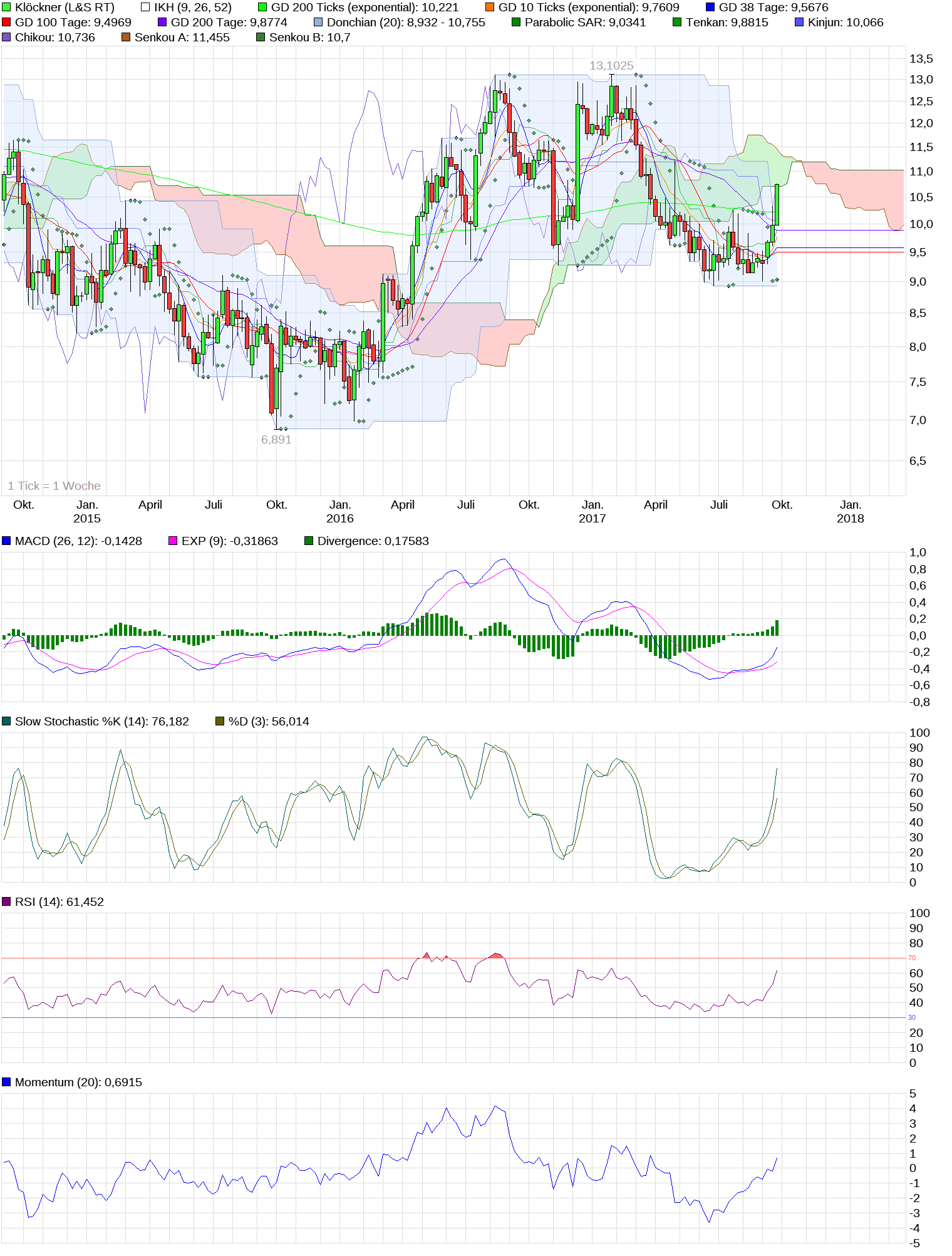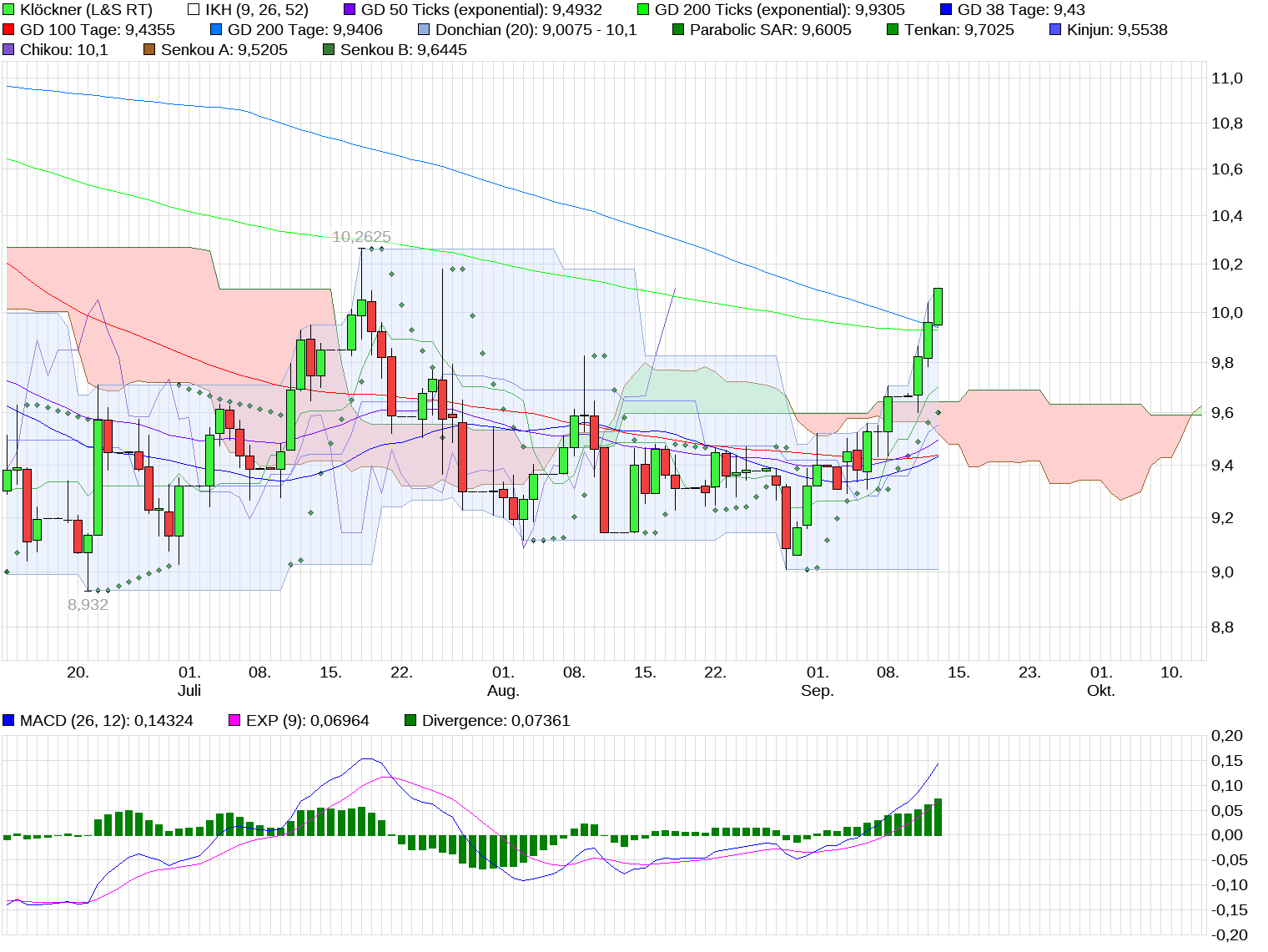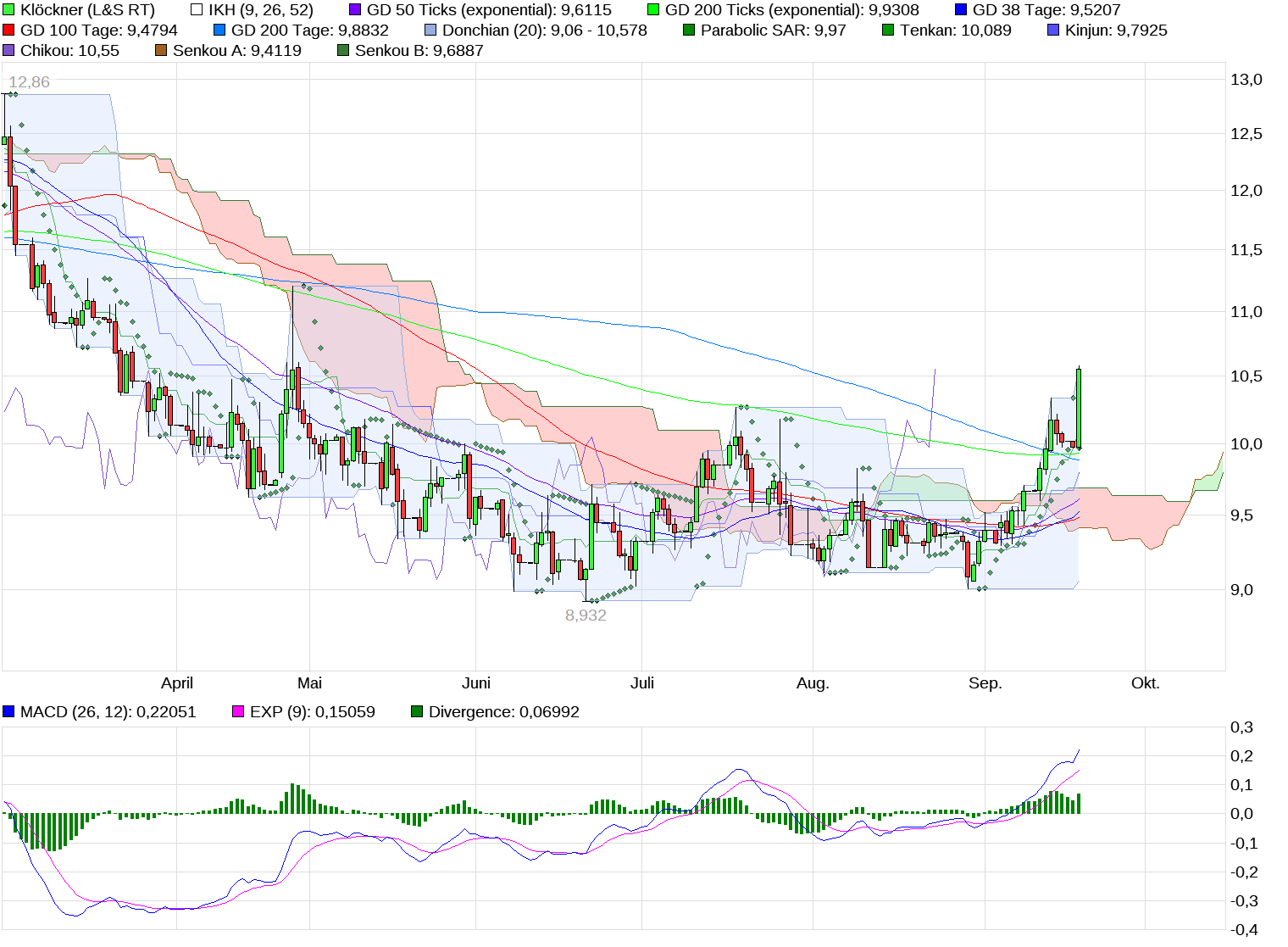 Mittelfristig sind die Widerstände abgearbeitet, so daß man bereits den 3-Jahres-Chart zur Hand nehmen muß. Dieser weist aus meiner Sicht den nächsten Widerstand bei ca. 11,50 € oberhalb der Wolke aus. Bis zu diesem Wert würde ich an Deiner Stelle die Aktien mindestens halten, so sieht jedenfalls mein Fahrplan aus. Wird dieser Widerstand genommen, dann sind Kurse in den Bereich von 13 € und darüber möglich. Unterstützt wird diese Analyse durch die Indikatoren, die alle auf “Kaufen“ geschaltet haben und noch gewaltig “Luft“ nach oben haben! Also, bis 11,50 € den Kurs gut im Auge behalten und danach entsprechend handeln. Ich selbst habe eigentlich vor, meine Aktien ernsthaft erst nach 13 € zu traden, bis dahin heißt es eben “schwitzen“ ! ;))