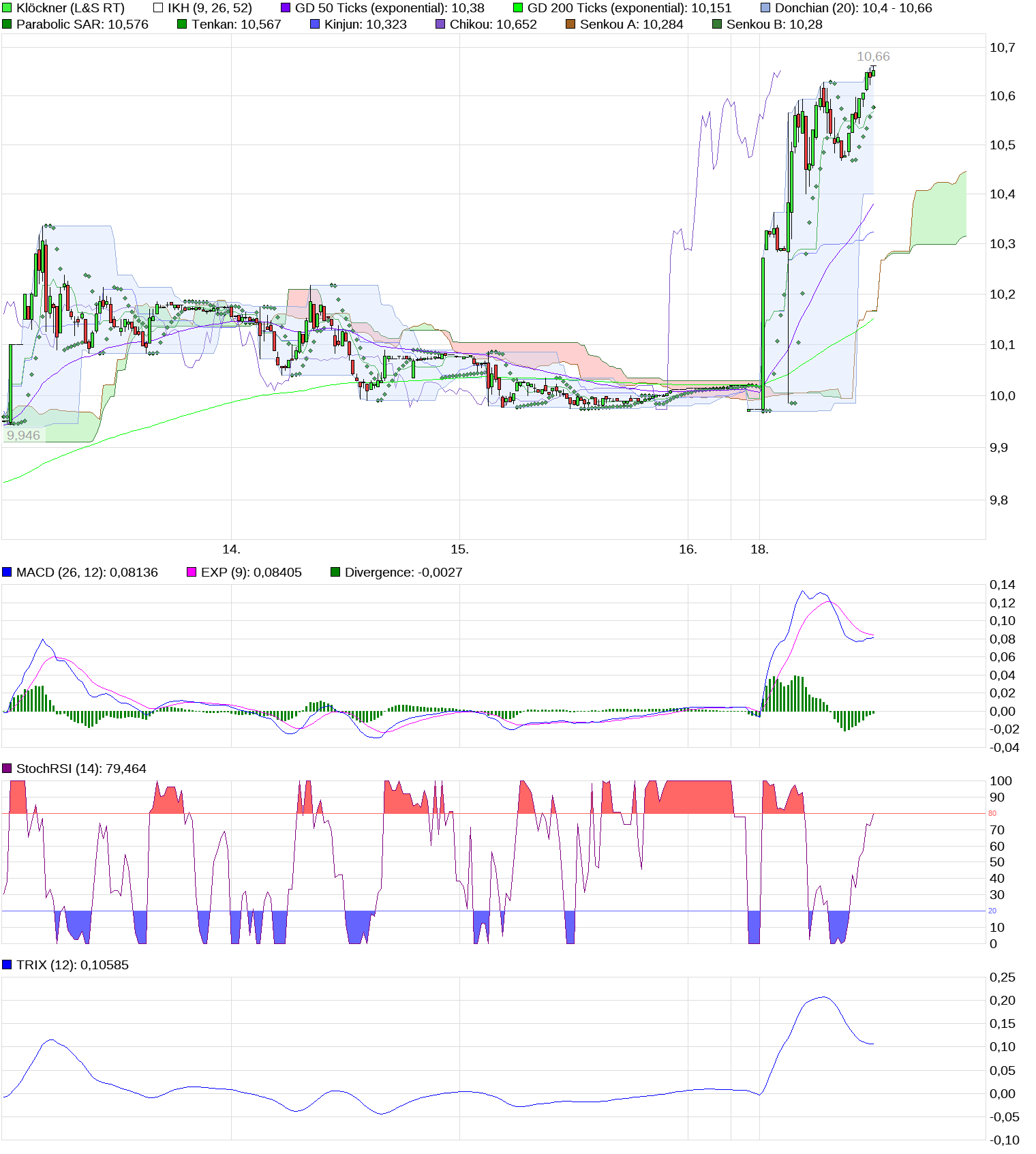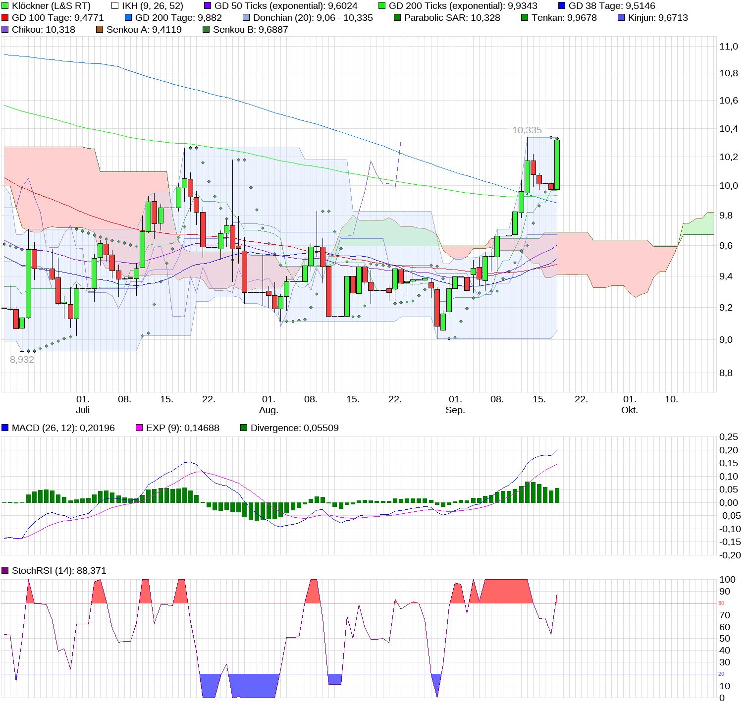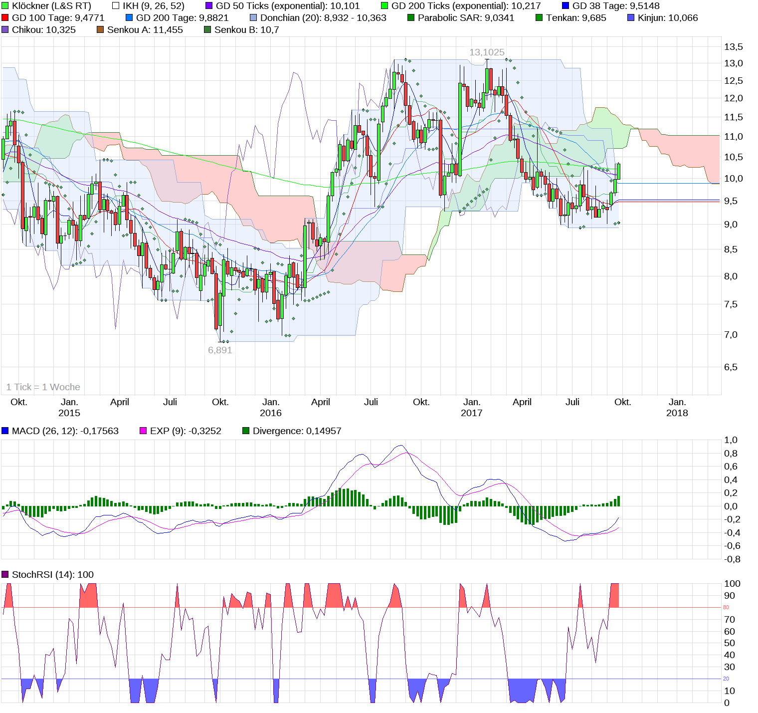 Mittelfristig sind die Widerstände abgearbeitet, so daß man bereits den 3-Jahres-Chart zur Hand nehmen muß. Dieser weist aus meiner Sicht den nächsten Widerstand bei ca. 11,50 € oberhalb der Wolke aus. Bis zu diesem Wert würde ich an Deiner Stelle die Aktien mindestens halten, so sieht jedenfalls mein Fahrplan aus. Wird dieser Widerstand genommen, dann sind Kurse in den Bereich von 13 € und darüber möglich. Unterstützt wird diese Analyse durch die Indikatoren, die alle auf “Kaufen“ geschaltet haben und noch gewaltig “Luft“ nach oben haben! Also, bis 11,50 € den Kurs gut im Auge behalten und danach entsprechend handeln. Ich selbst habe eigentlich vor, meine Aktien ernsthaft erst nach 13 € zu traden, bis dahin heißt es eben “schwitzen“ ! ;))